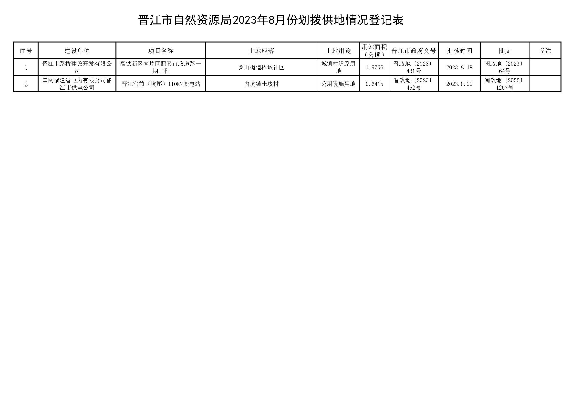 晋江市自然资源局2023年8月份划拨供地情况登记表