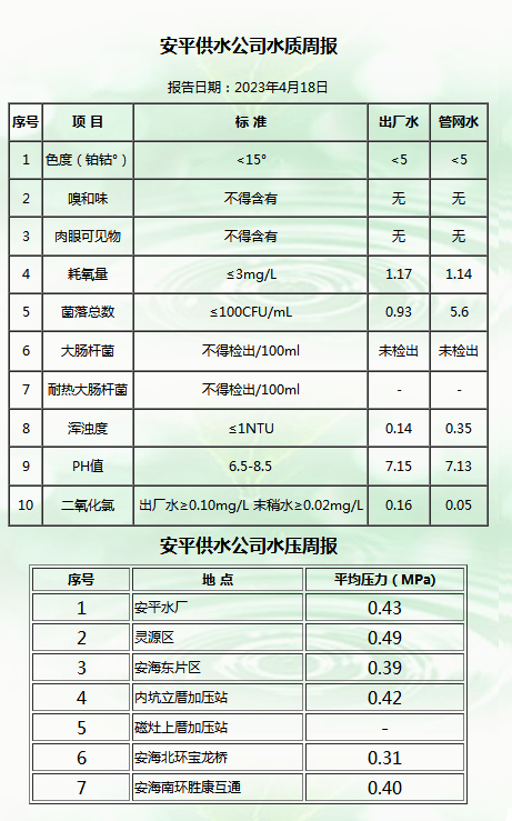 泉州安平供水有限公司供水水质周报公告(2023年4月18日)