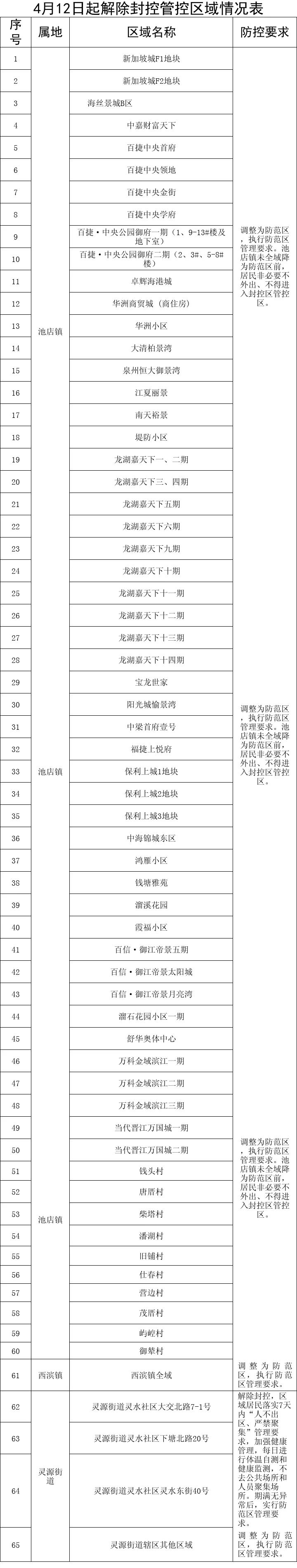 一、自2022年4月12日起,解除池店镇新加坡城F1地块等50个小区、钱头村等10个村(名单附后)和西滨镇全域管控区管理,调整为防范区;解除灵源街道灵水社区大交北路7-1号、下塘北路20号、灵水东街40号等3个封控区管理,解封后灵源街道辖区内无封控区,全域调整为防范区。