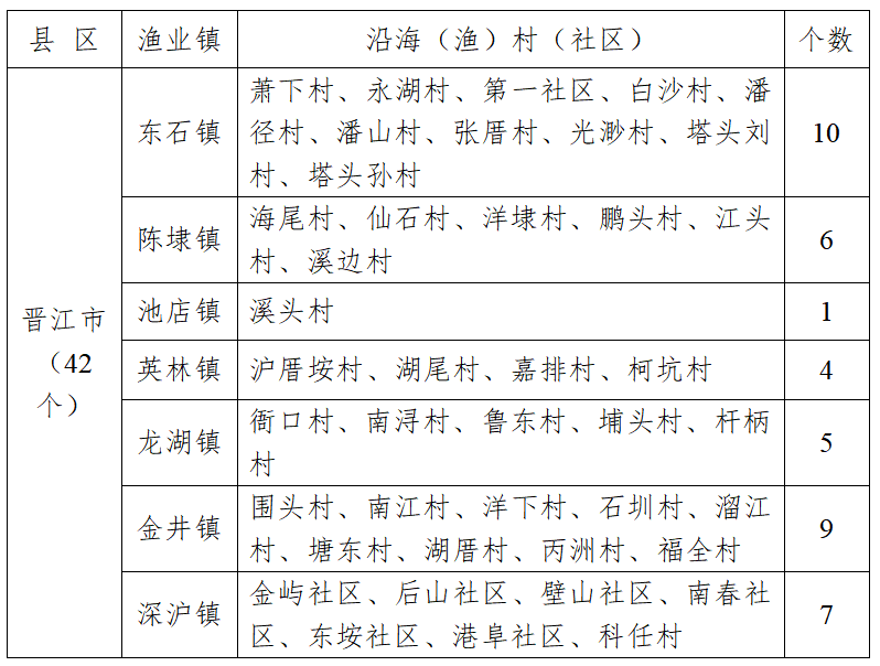 (三)东石、陈埭、池店、英林、龙湖、金井、深沪等7个镇的42个沿海(渔)村(详见附件)每天抽检20%人员,每五天一轮全覆盖。