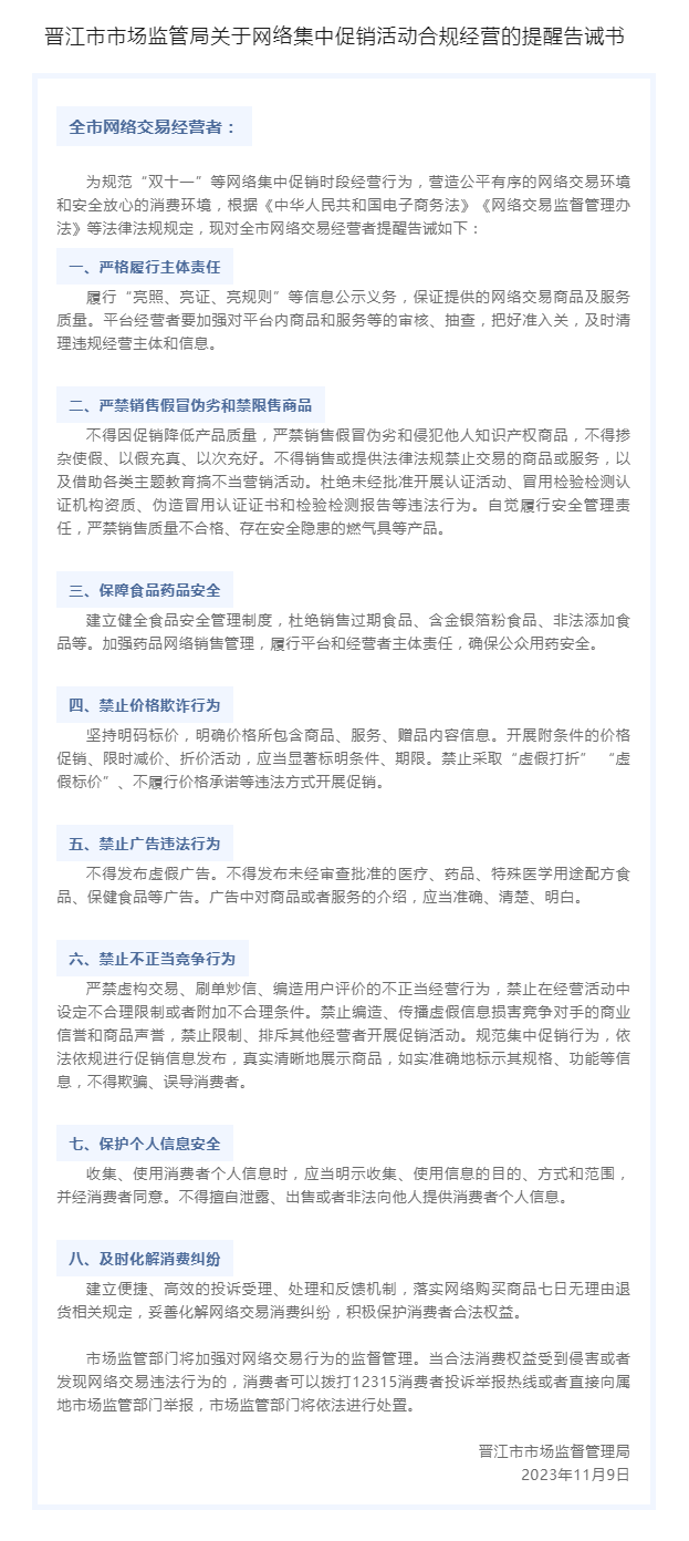【提醒】晋江市市场监管局关于网络集中促销活动合规经营的提醒告诫书