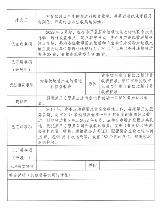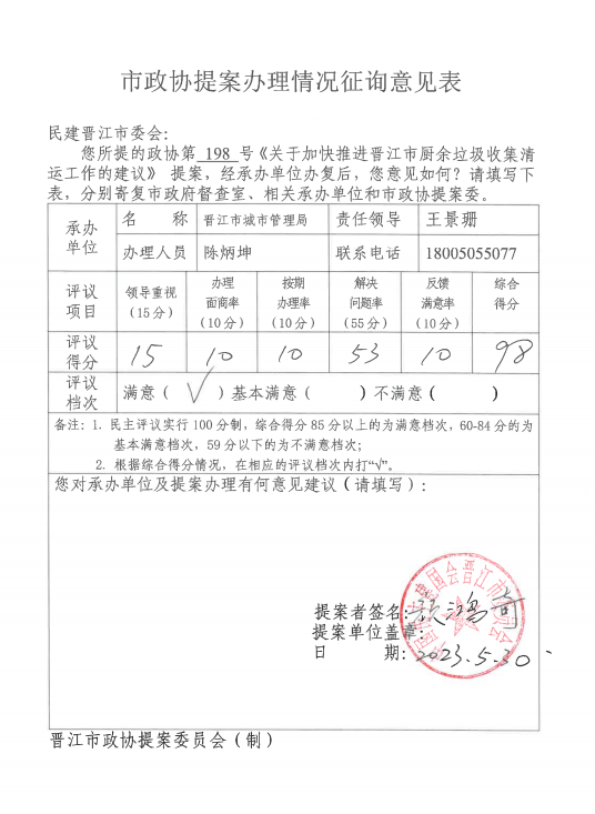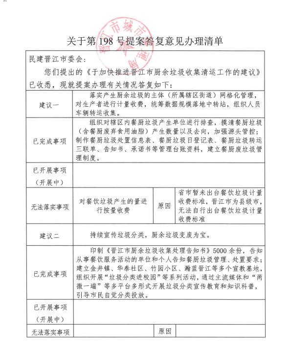 您提出的《关于加快推进晋江市厨余垃圾收集清运工作的建议》收悉。现将办理情况答复如下: