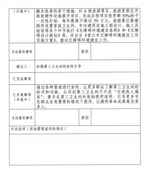 二、落实资金扶持,加大建设力度。城乡公厕方面,由城市管理局牵头,2018年-2022年共完成公厕新改建480余座,2023年继续推进“厕所革命”,新建公厕项目给予100%补助,最高不超过25万元;改建公厕项目给予80%补助,最高不超过15万元。城市管理局指导各镇街按照《城市公共厕所设计标准》重点增加布设第三卫生间,明确要求一类公厕必须有独立第三卫生间、卫生间内部配备儿童小便器、母婴台、儿童洗手池等方便哺乳妇女和儿童使用,二类公厕有条件的也要配备第三卫生间。2018年组织对市区8座有条件的公厕进行改造,增设第三卫生间,内设儿童坐便器、婴儿台等设施。景区公厕方面,目前五店市、安平桥、梧林传统村落设有家庭卫生间(第三卫生间),其它旅游厕所均设有残障厕位。2021年-2023年,市文旅局积极推荐旅游厕所项目申报省级或泉州市级示范性旅游厕所,争取上级资金支持;落实本级旅游产业扶持政策,对新获评3A、2A、1A级旅游厕所的,分别给予一次性10万元、8万元、5万元的补助;2023年出台促进文化和旅游产业、加快文体旅融合发展的若干措施,对A级旅游景区、旅游度假区开展软硬件设施提升项目,完成后按项目投资额50%给予一次性补助,每年最高不超过50万元,鼓励景区新建厕所设置家庭卫生间。市政房建工程方面,市住建局在施工图设计、施工及验收等各个环节执行《无障碍环境建设条例》和《无障碍设计规划》等,并出台《晋江市无障碍环境建设工作实施方案》,推动无障碍环境建设工作,2021年我市还被授予“创建全国无障碍环境达标市”称号。