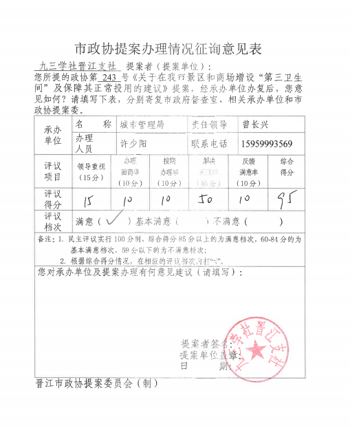 您们提出的《关于在我市景区和商场增设“第三卫生间”及保障其正常投用的建议》收悉。现将办理情况答复如下: