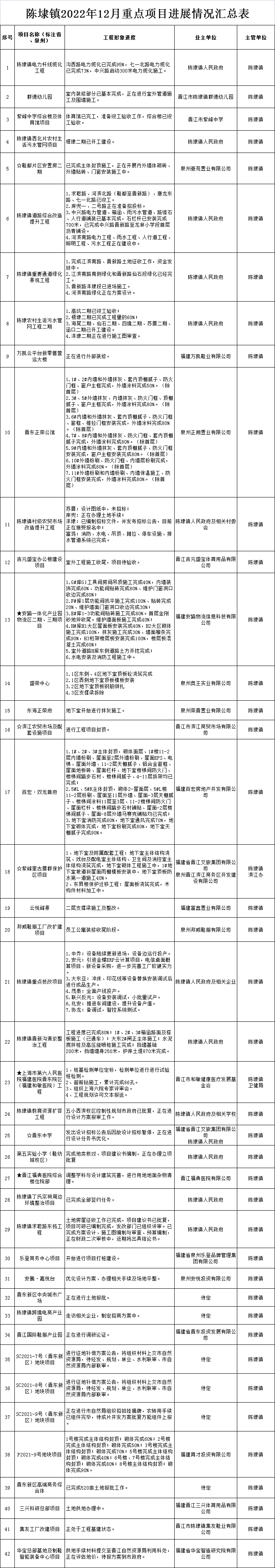 【晋江市陈埭镇】陈埭镇2022年12月重点项目进展情况汇总表
