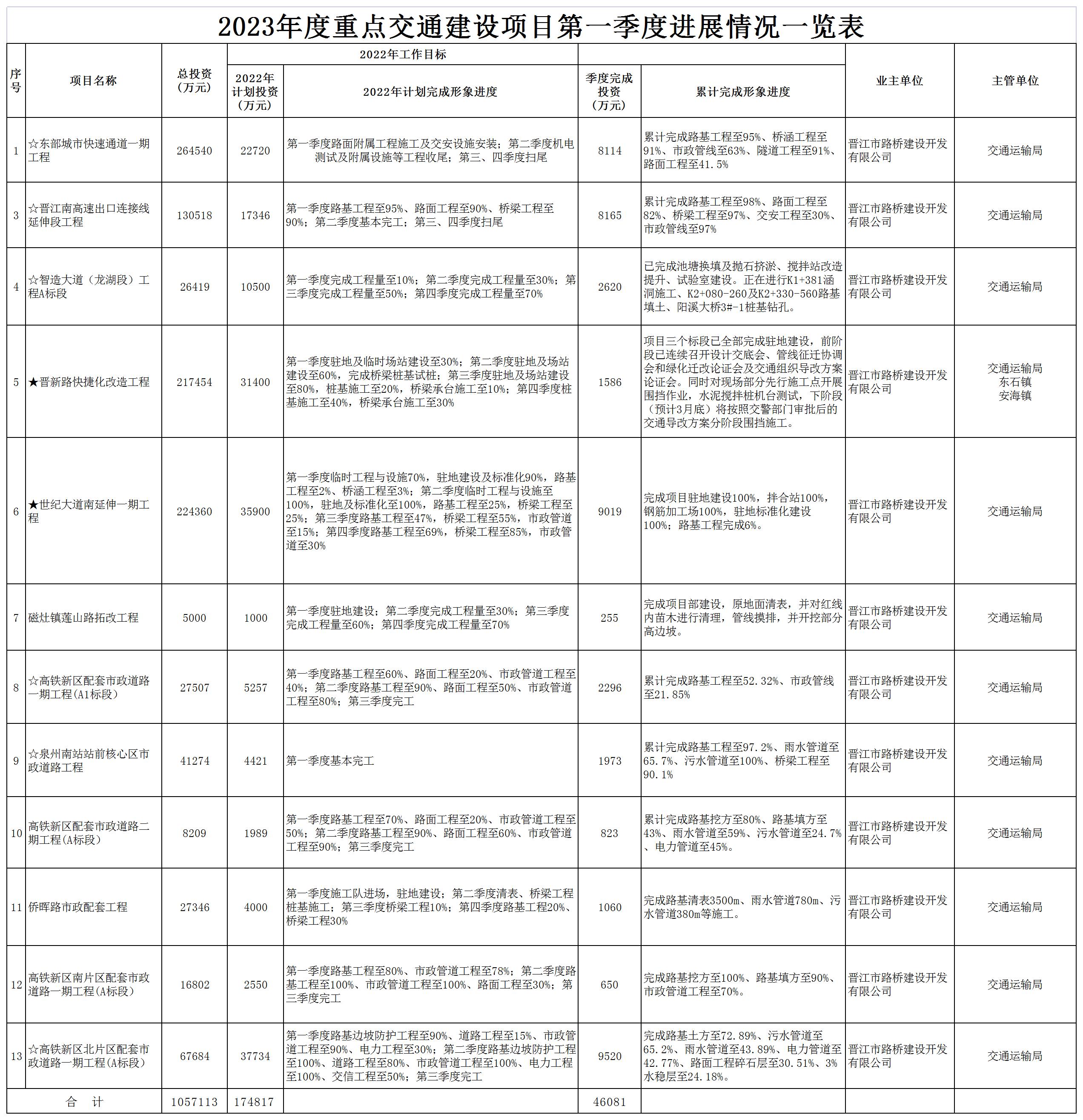 晋江市交通运输局2023年度重点交通建设项目第一季度进展情况一览表