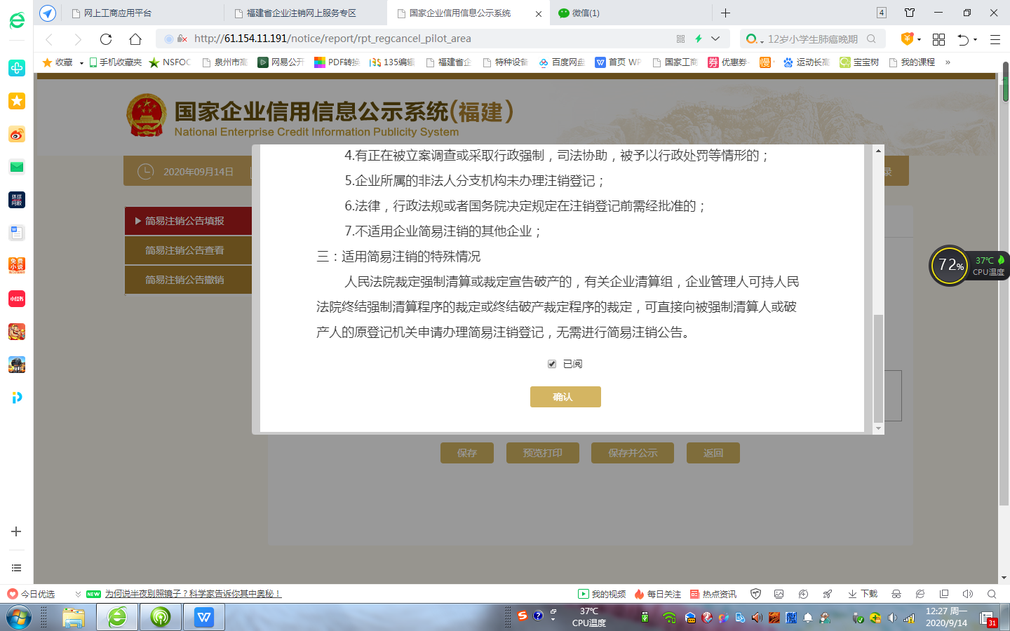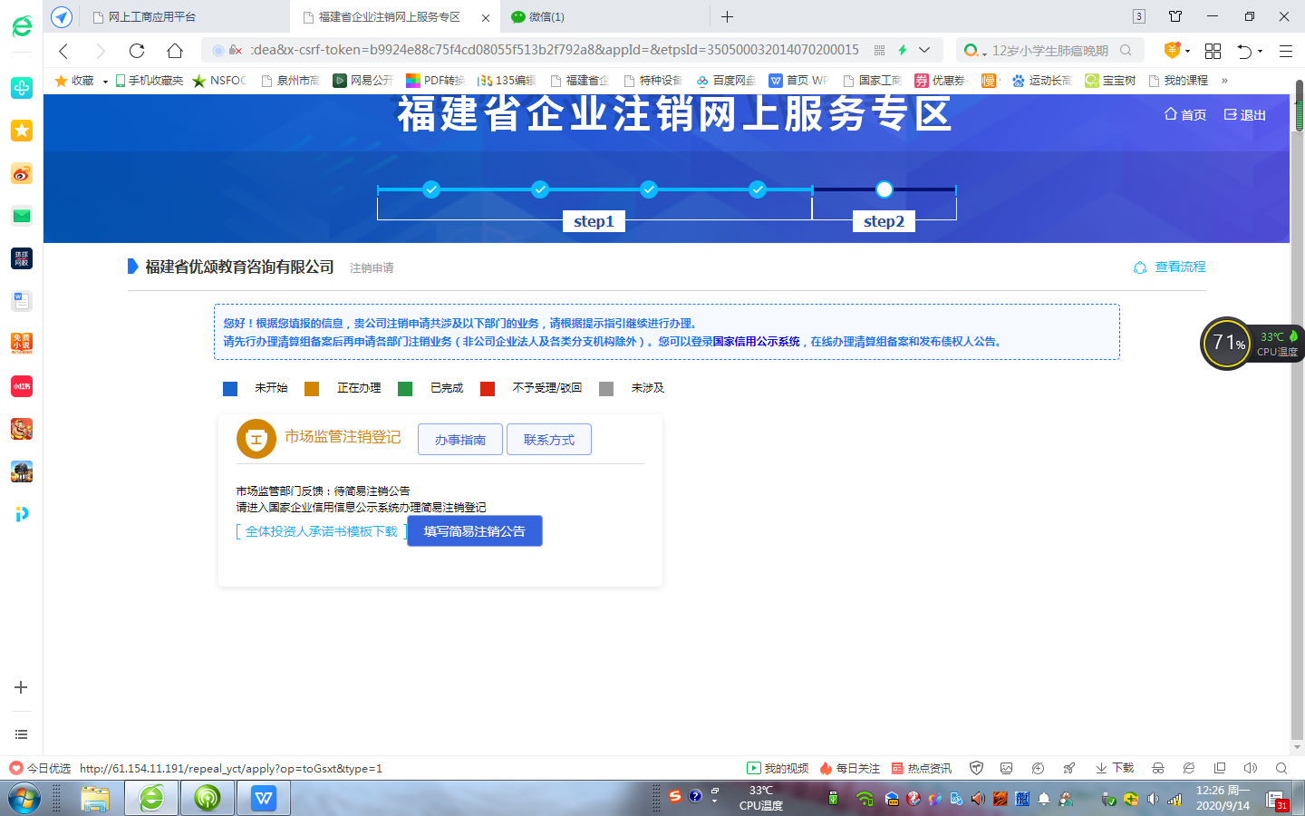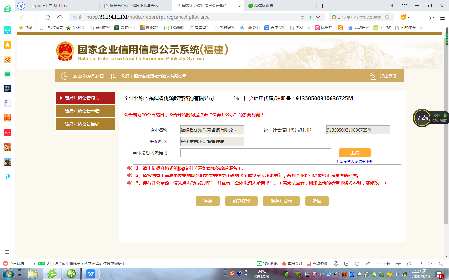 10.填写前面下载的“全体投资人承诺书”,并进行上传,并按照提示进行简易注销公告,公告期满后即可到窗口办理简易注销。