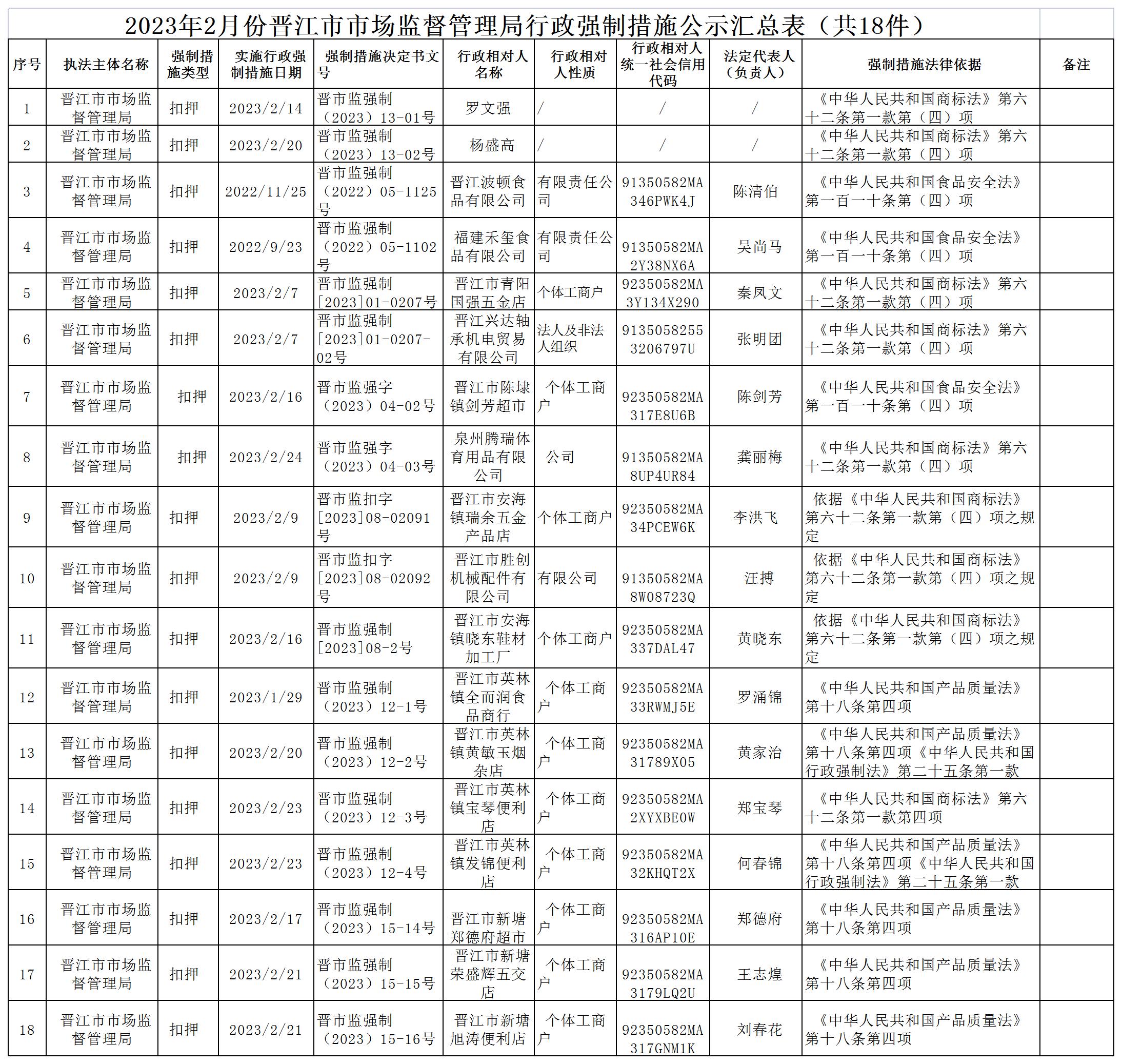 2023年2月份晋江市市场监督管理局行政强制措施公示汇总表(共18件)