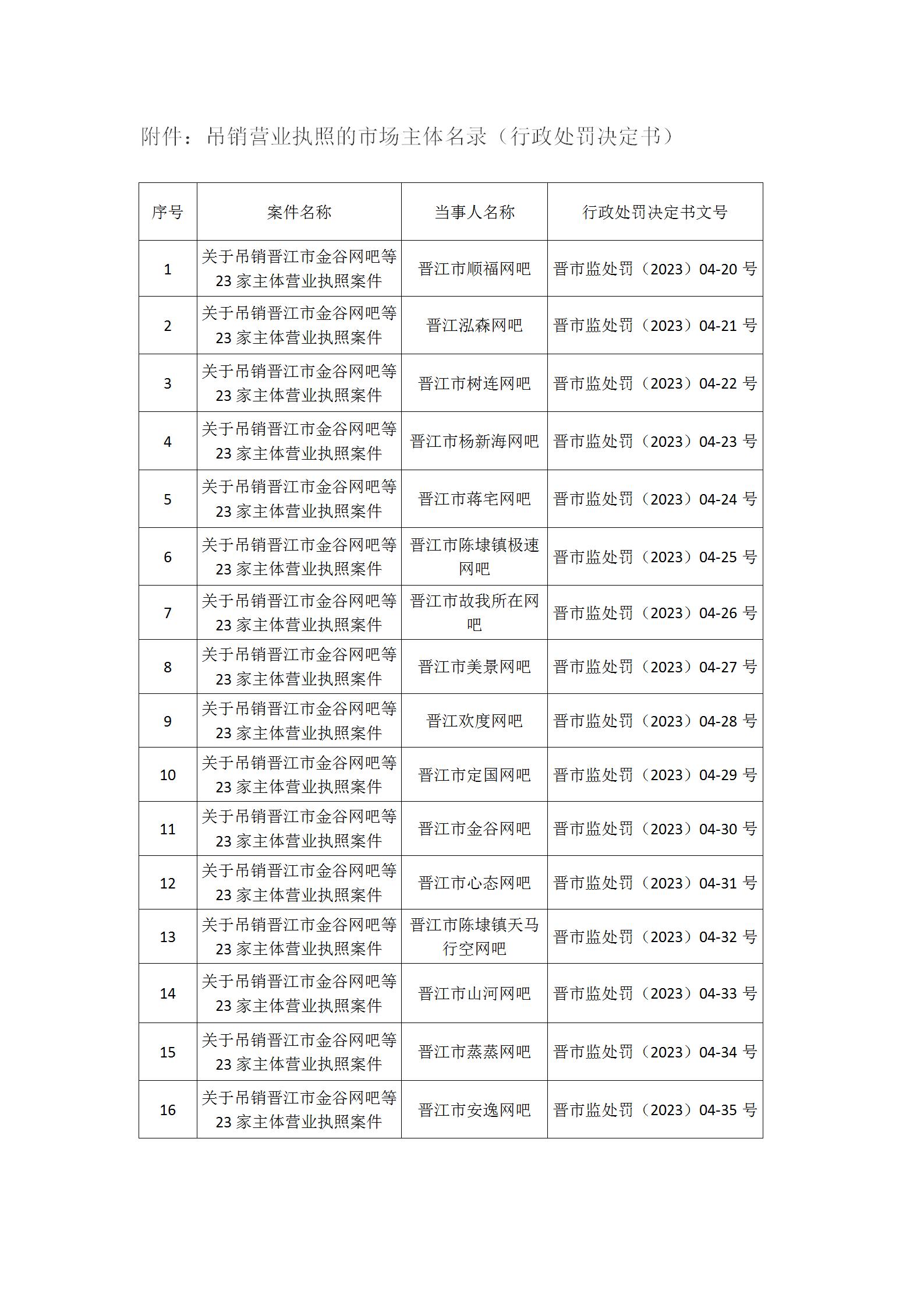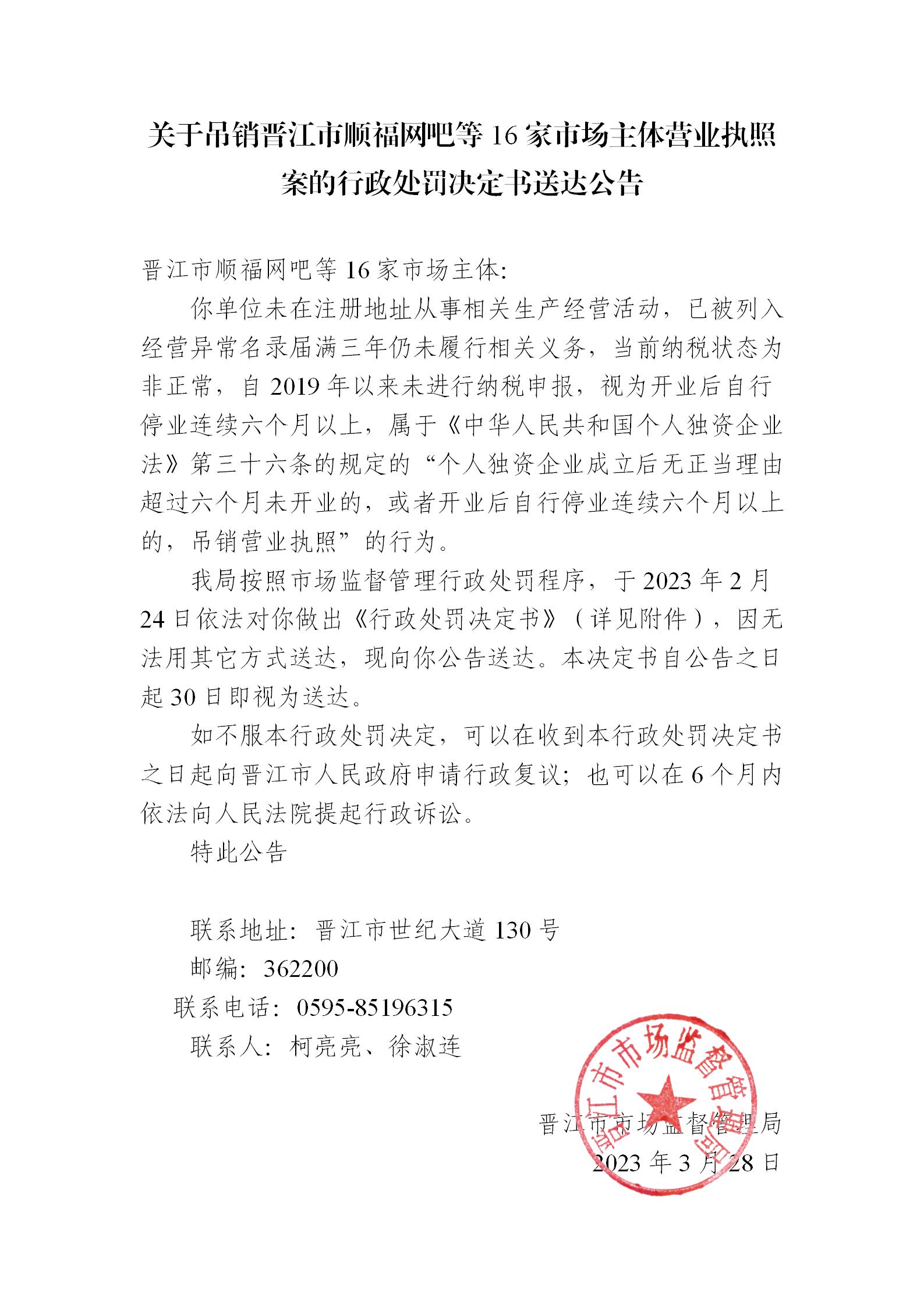 关于吊销晋江市顺福网吧等16家市场主体营业执照案的行政处罚决定书送达公告