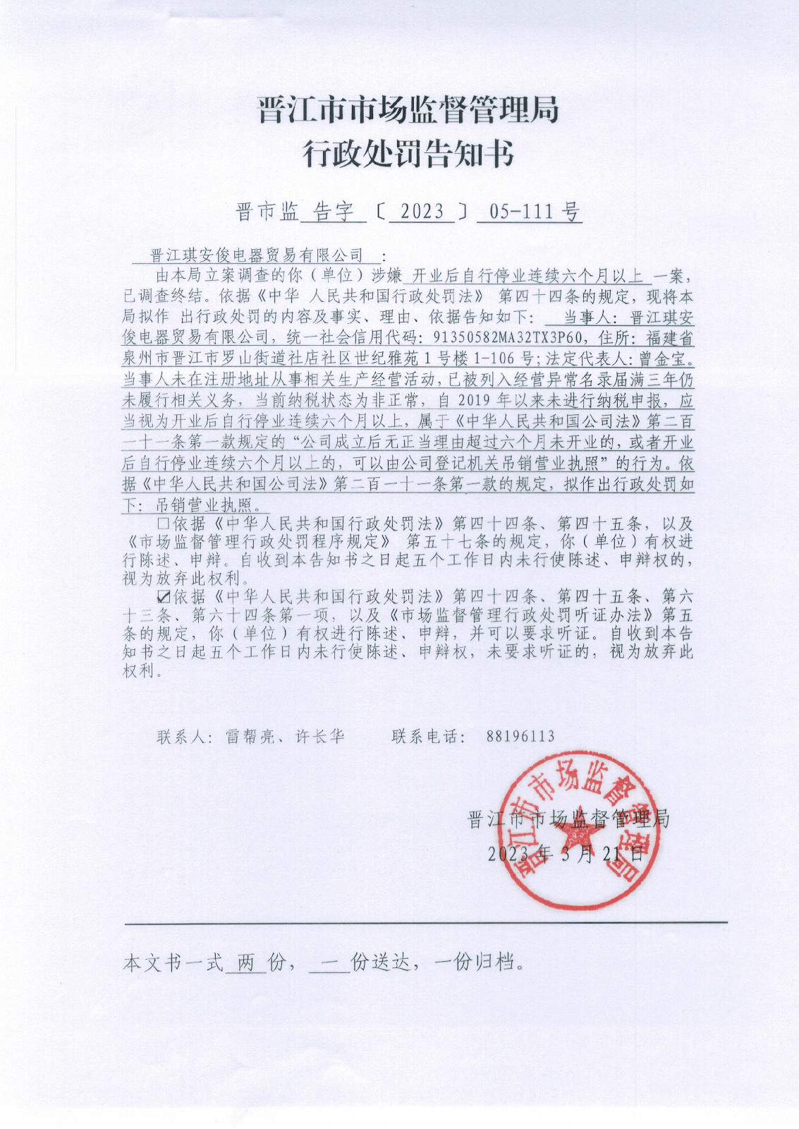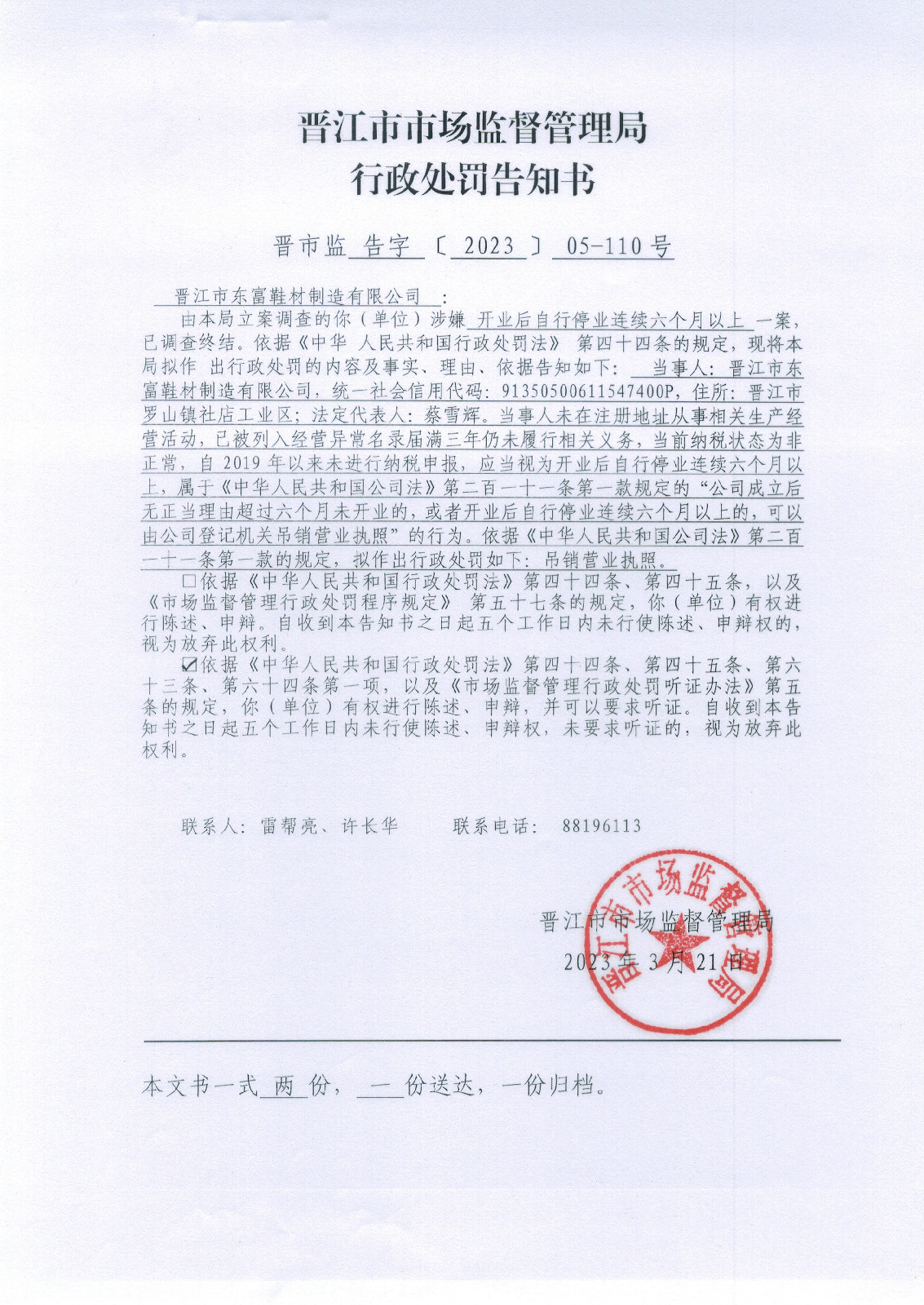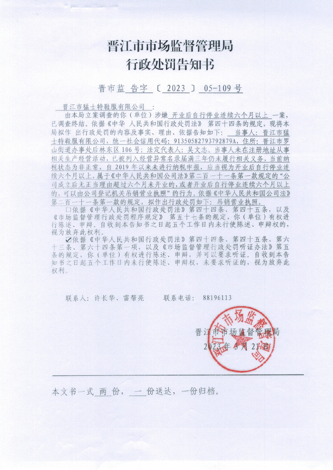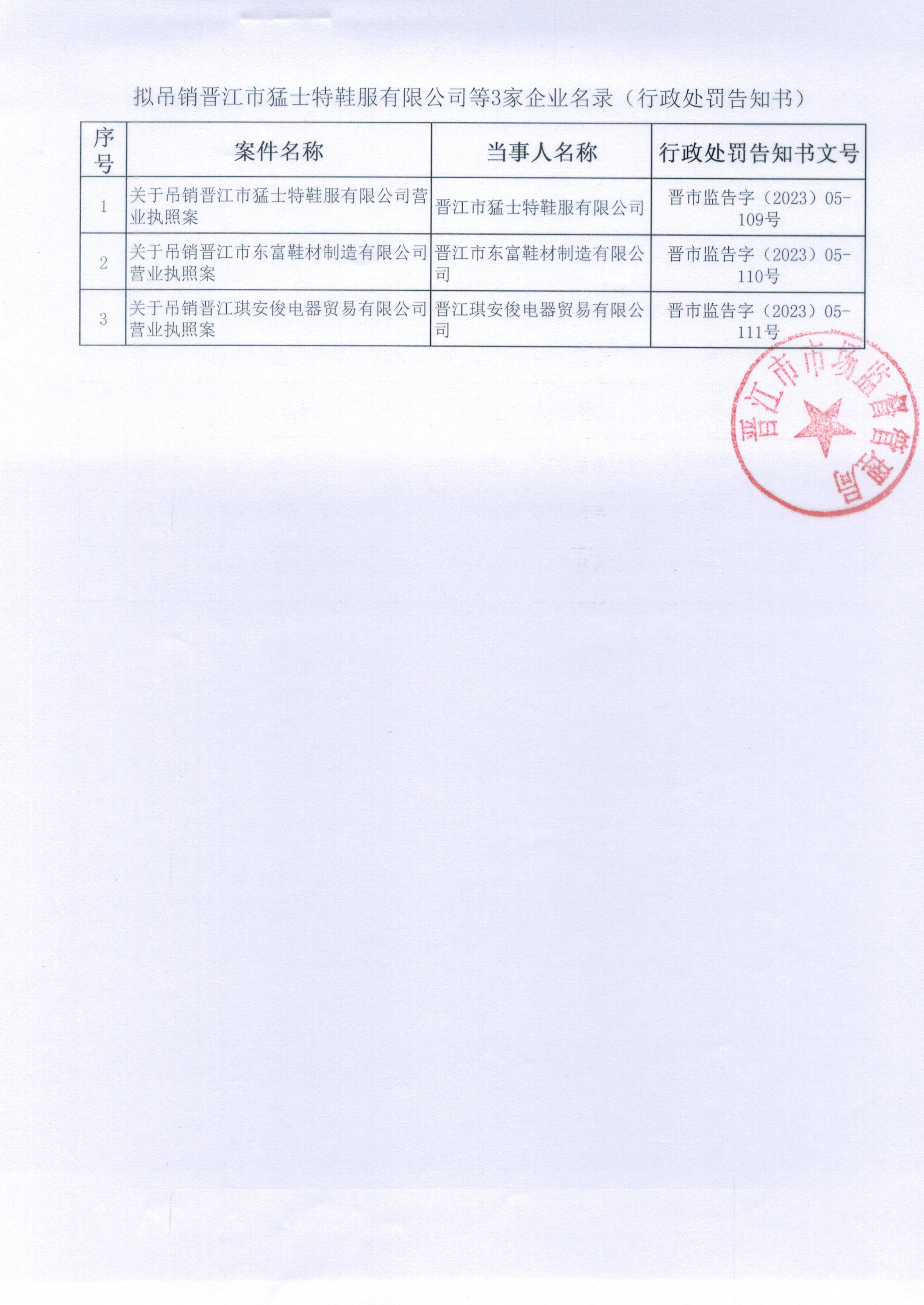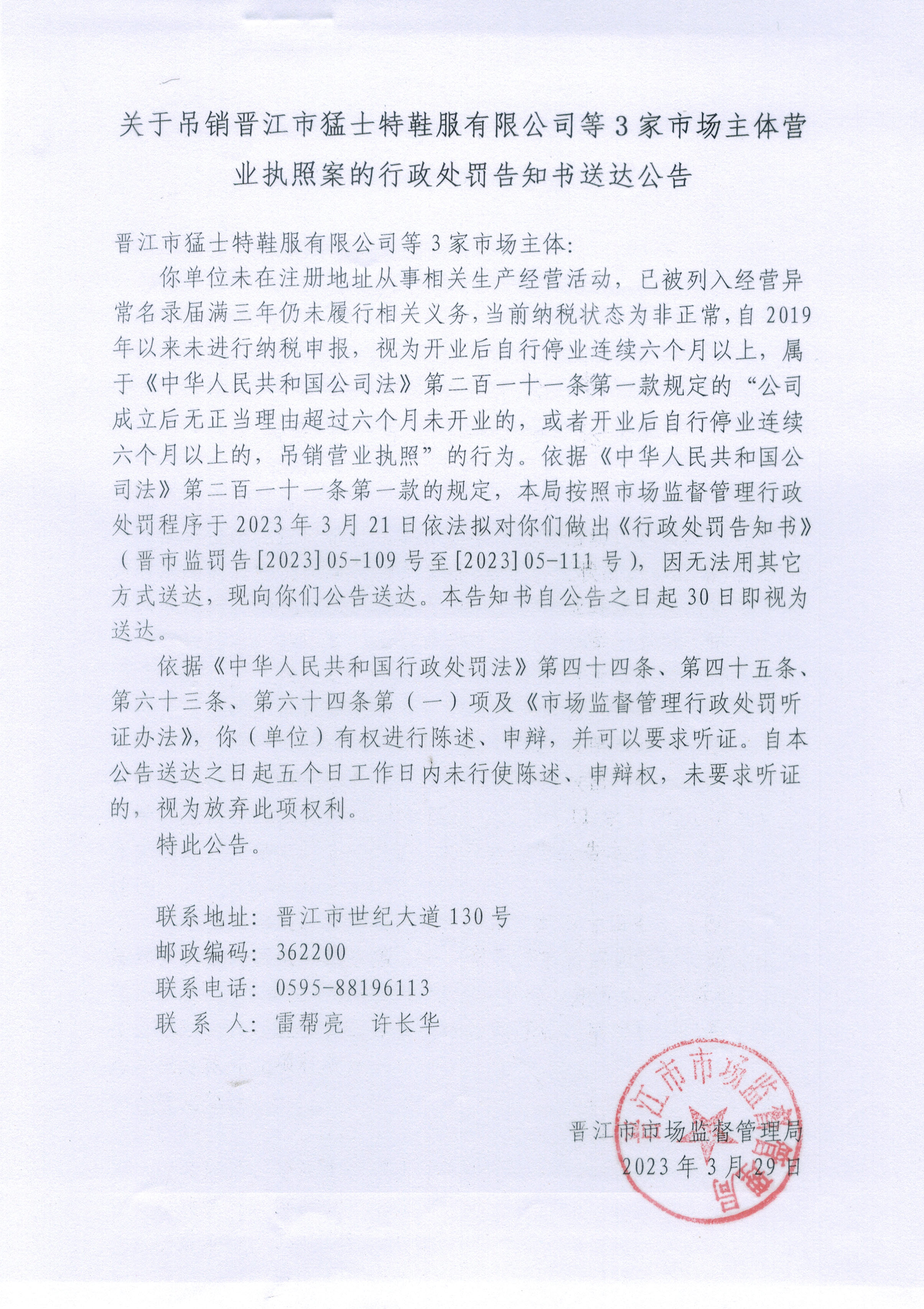 关于吊销晋江市猛士特鞋服有限公司等3家市场主体营业执照案的行政处罚告知书送达公告