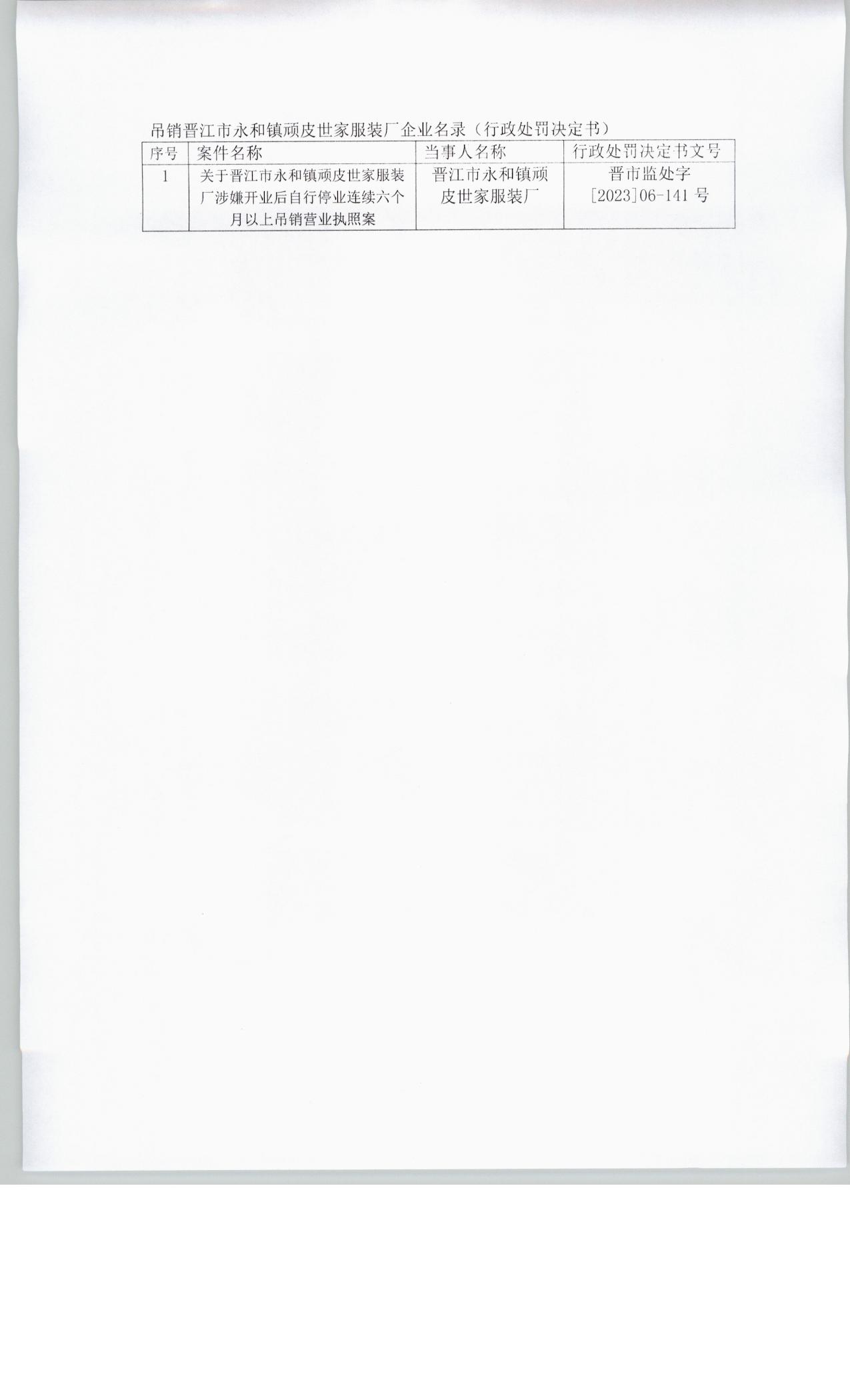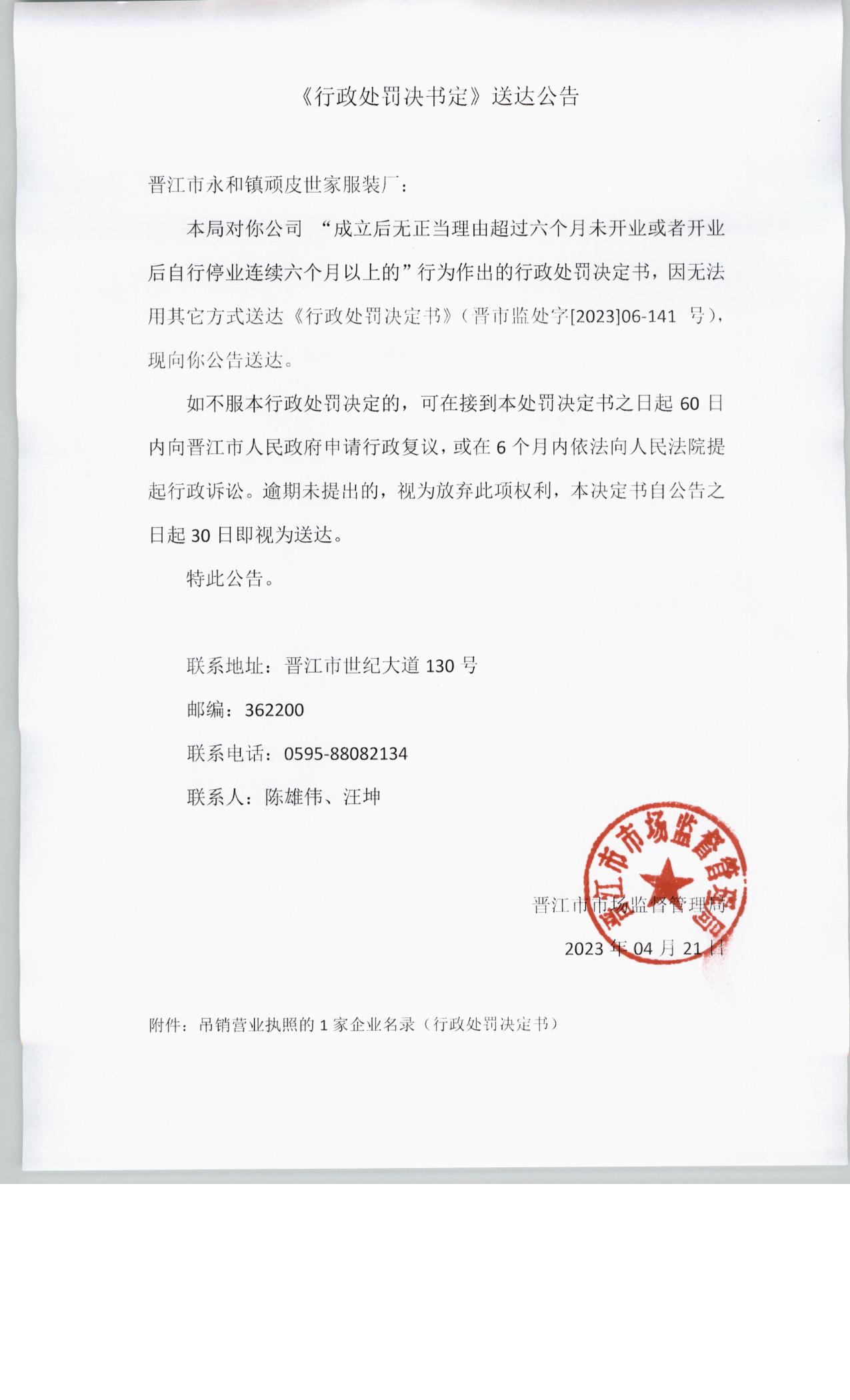 晋江市市场监督管理局行政处罚决定书送达公告(晋江市永和镇顽皮世家服装厂)
