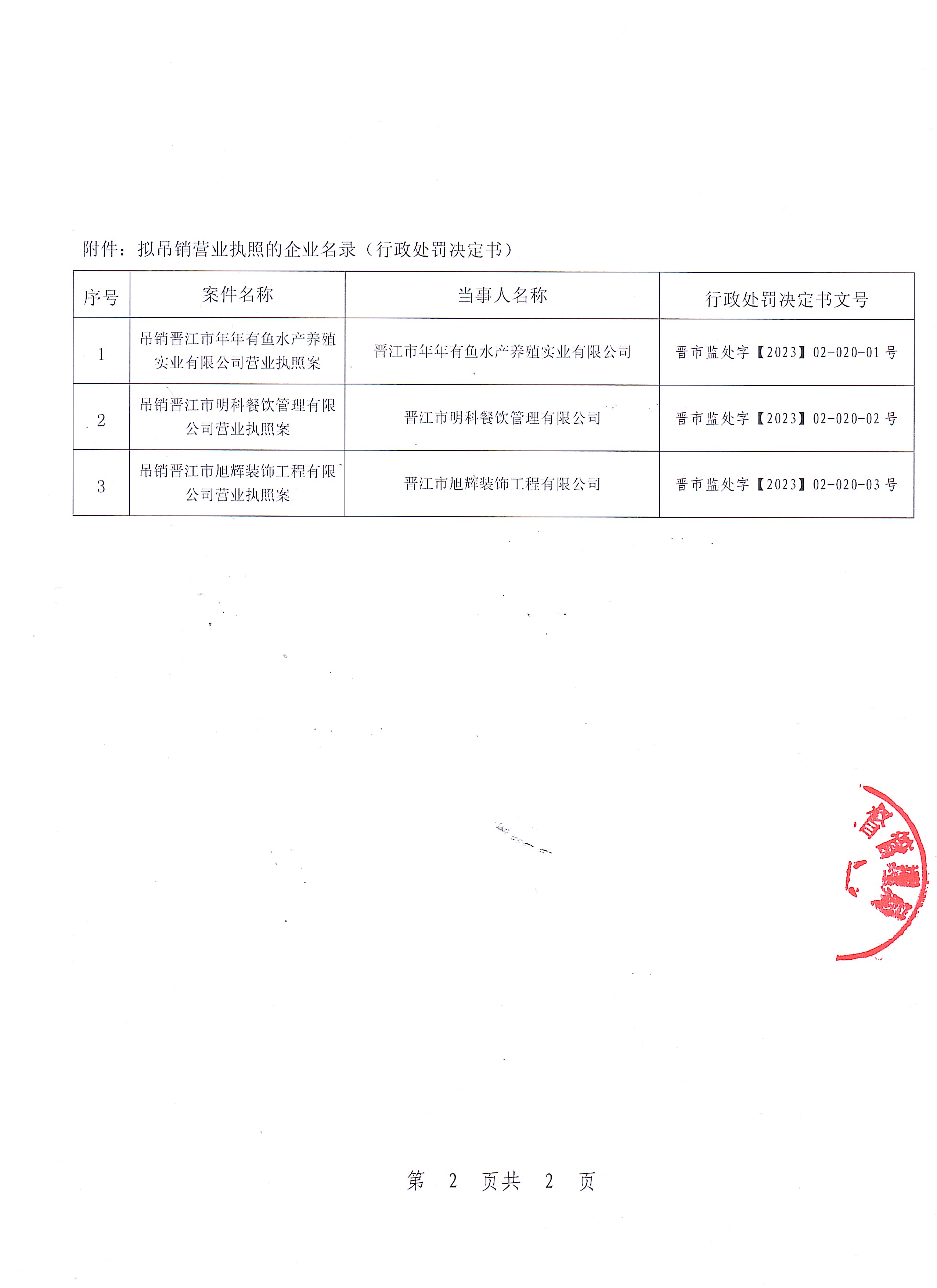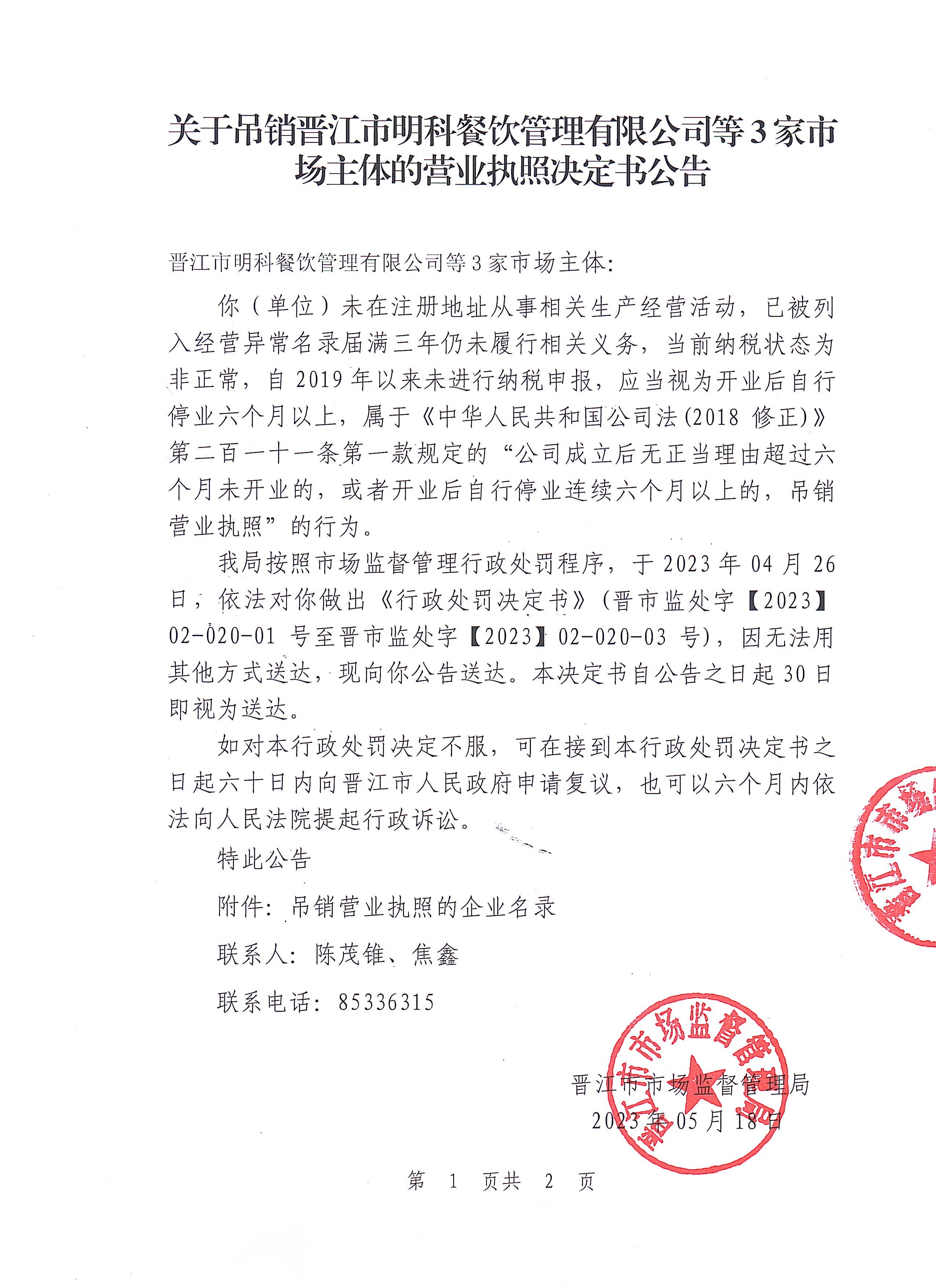 晋江市市场监督管理局关于吊销晋江市明科餐饮管理有限公司等3家市场主体的营业执照决定书公告