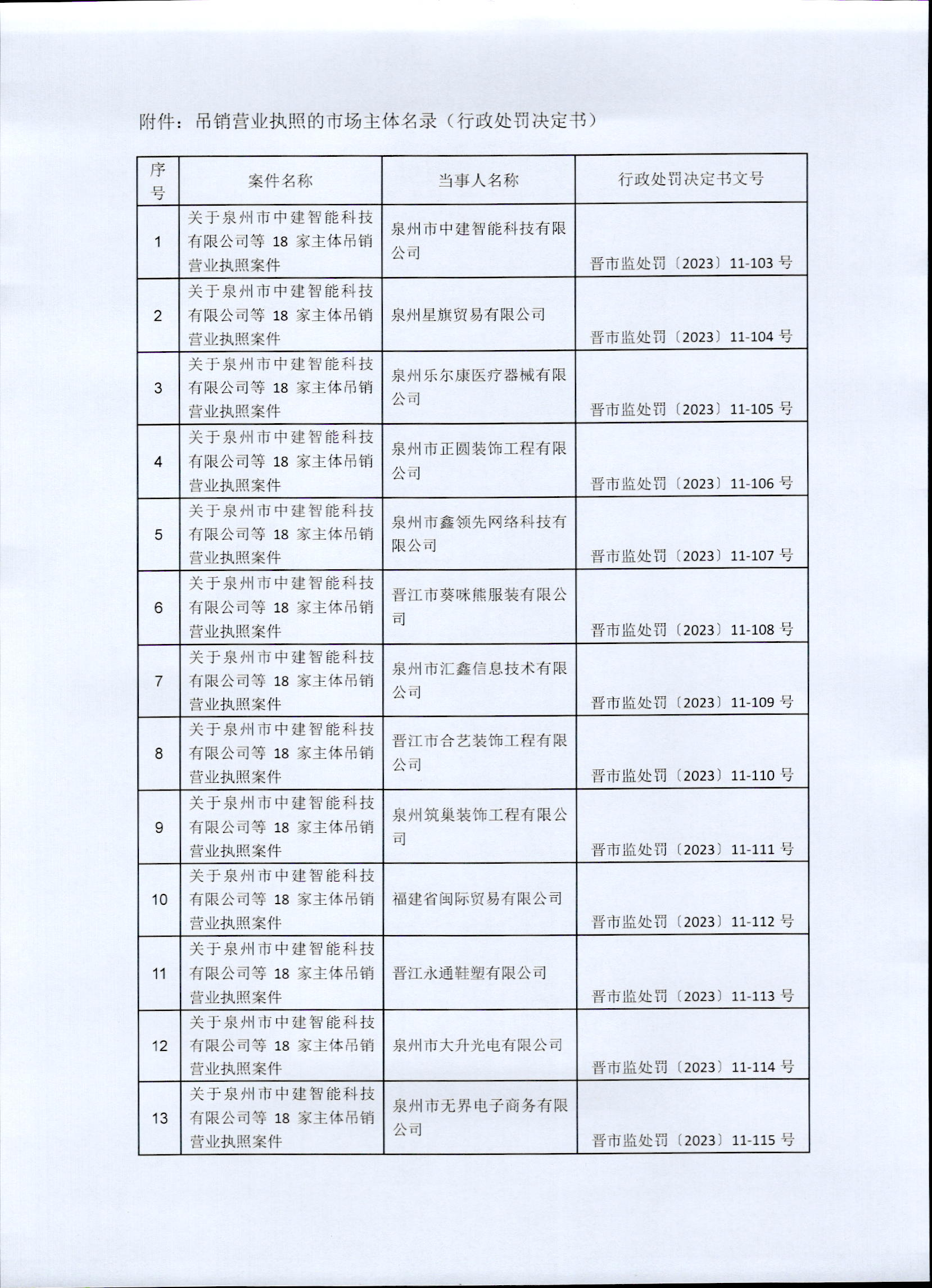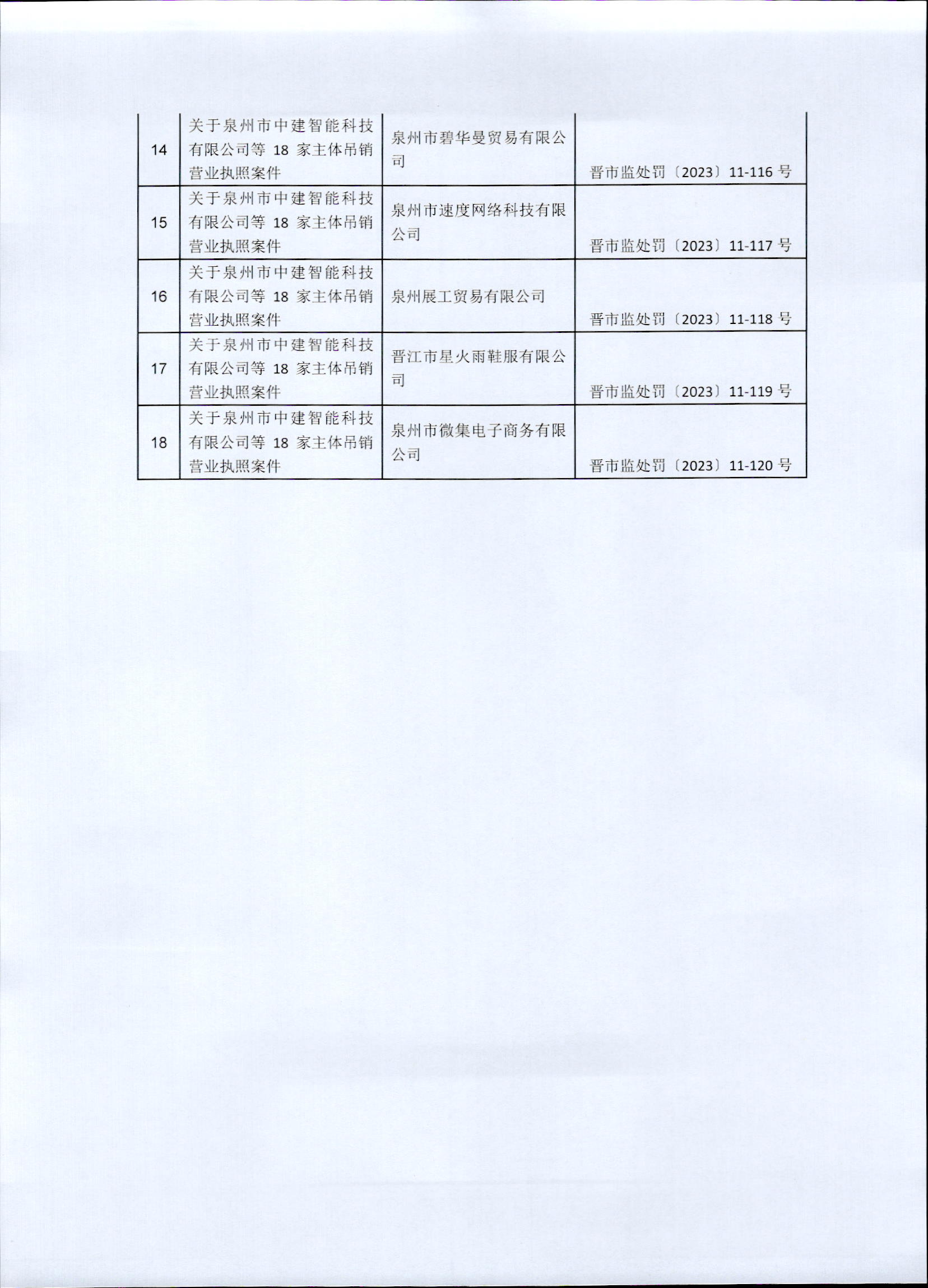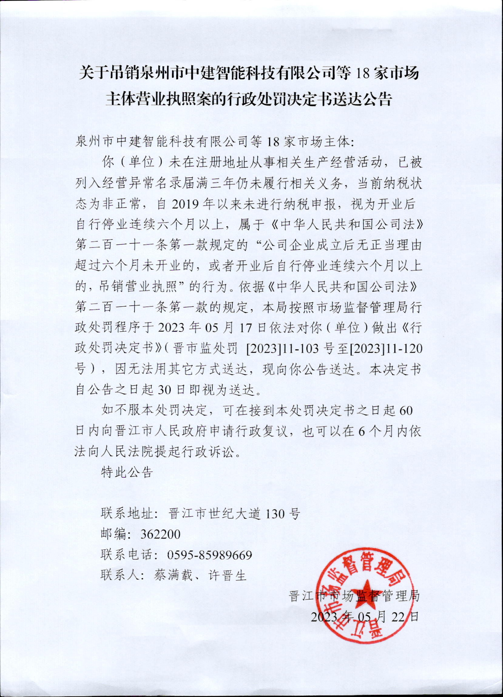 晋江市市场监督管理局关于吊销泉州市中建智能科技有限公司等18家市场主体营业执照案的行政处罚决定书送达公告