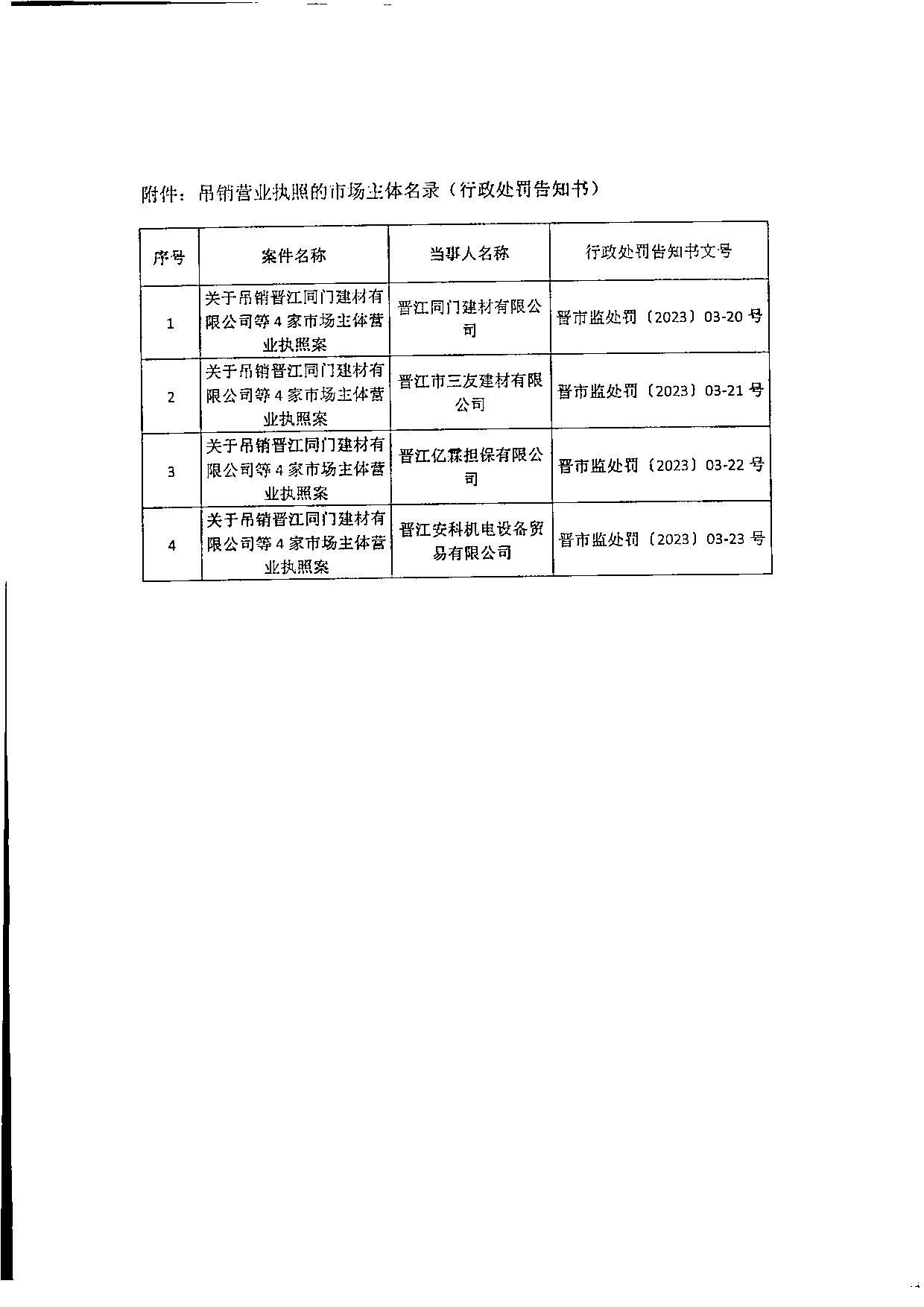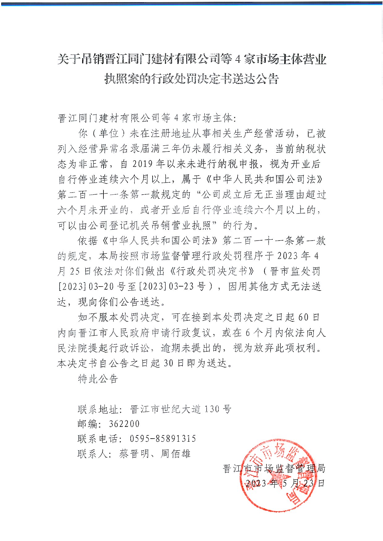 晋江市市场监督管理局关于吊销晋江同门建材有限公司等4家市场主体营业执照案的行政处罚决定书送达公告
