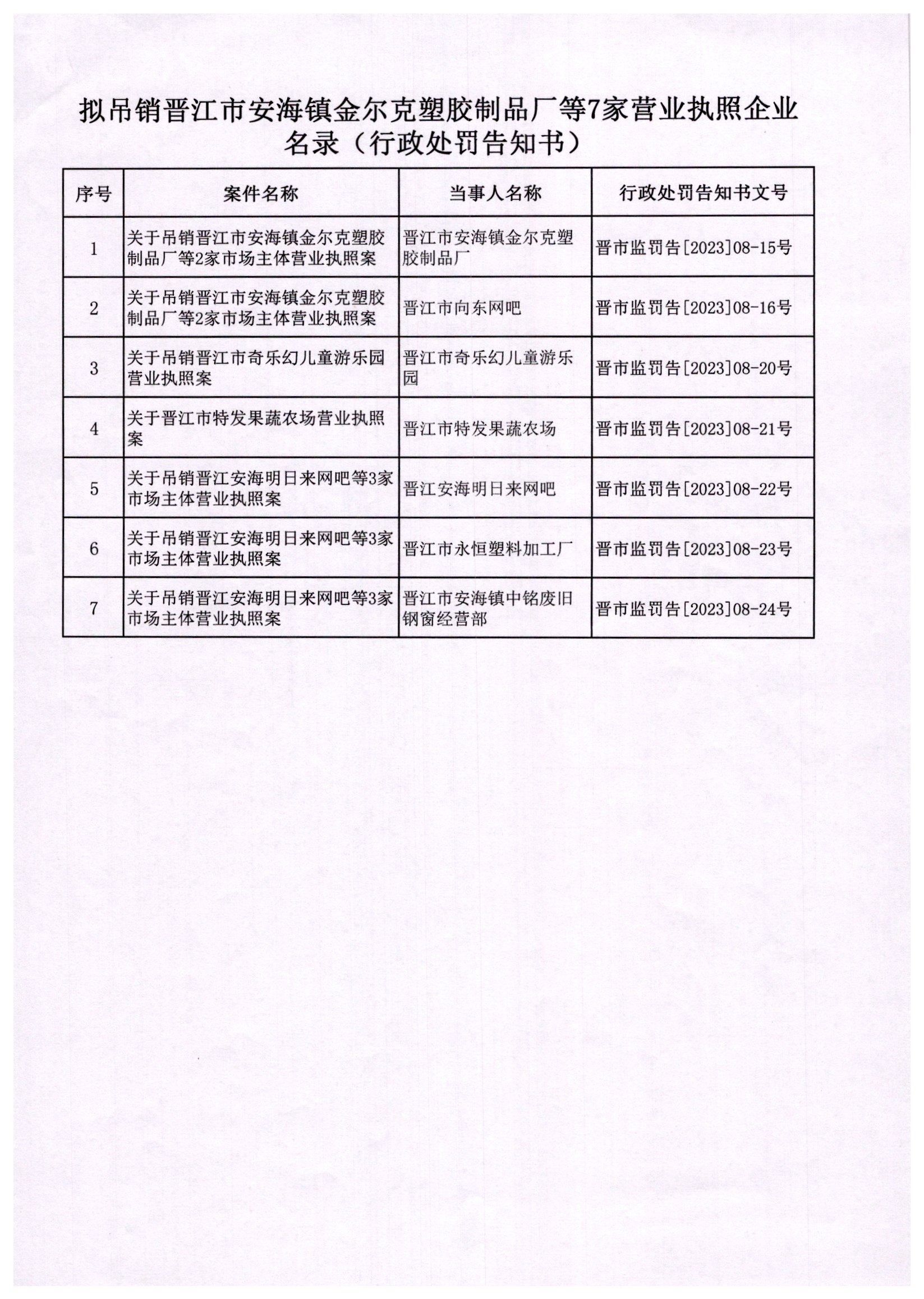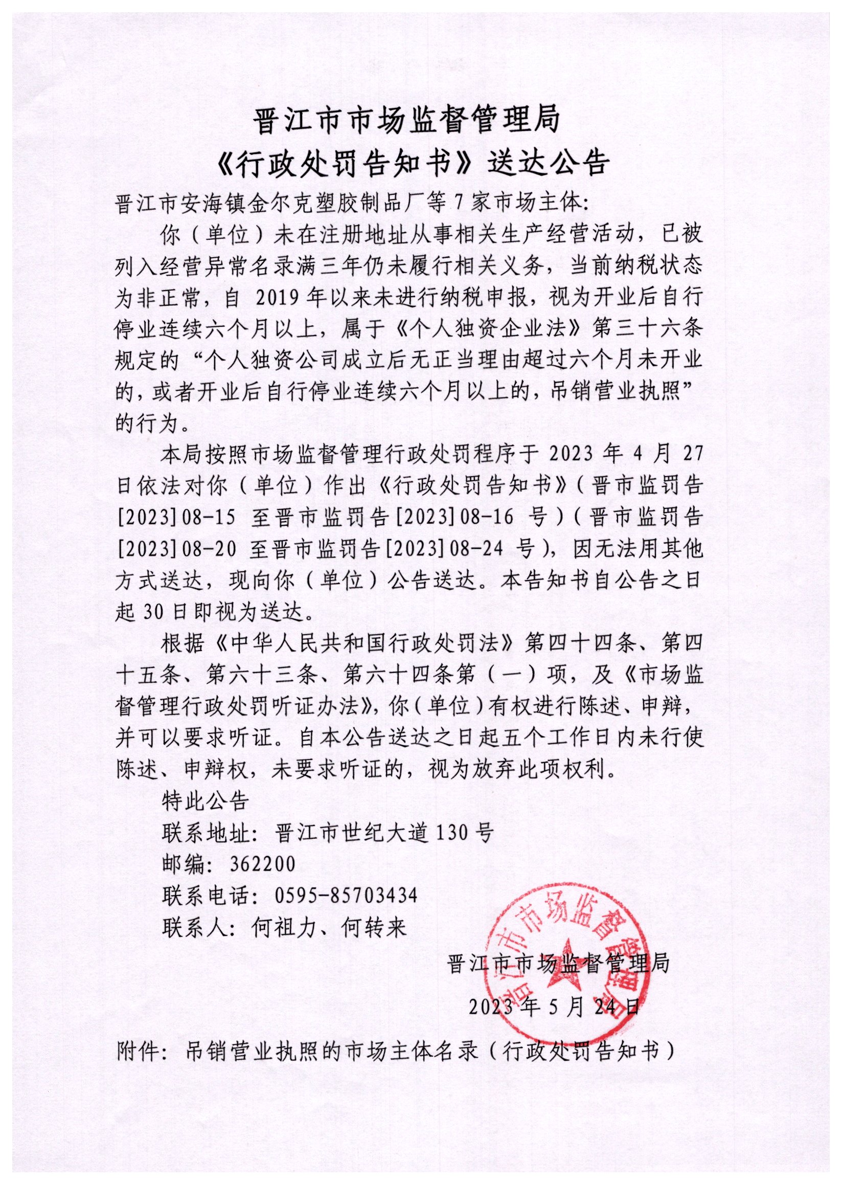 晋江市市场监督管理局关于吊销晋江市安海镇金尔克塑胶制品厂等7家市场主体营业执照的行政处罚告知书送达公告