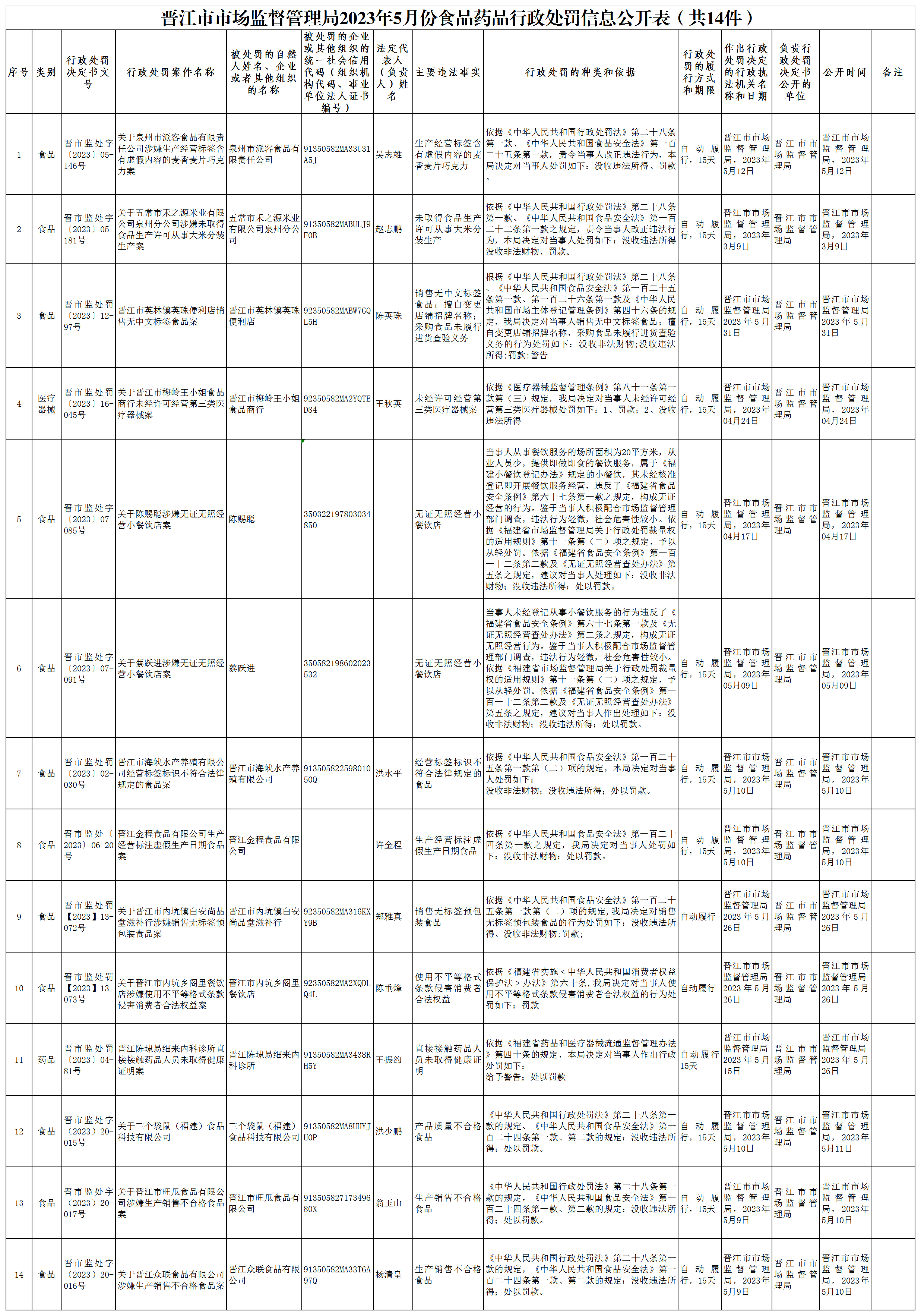 晋江市市场监督管理局2023年5月份食品药品行政处罚信息公开表(共14件)