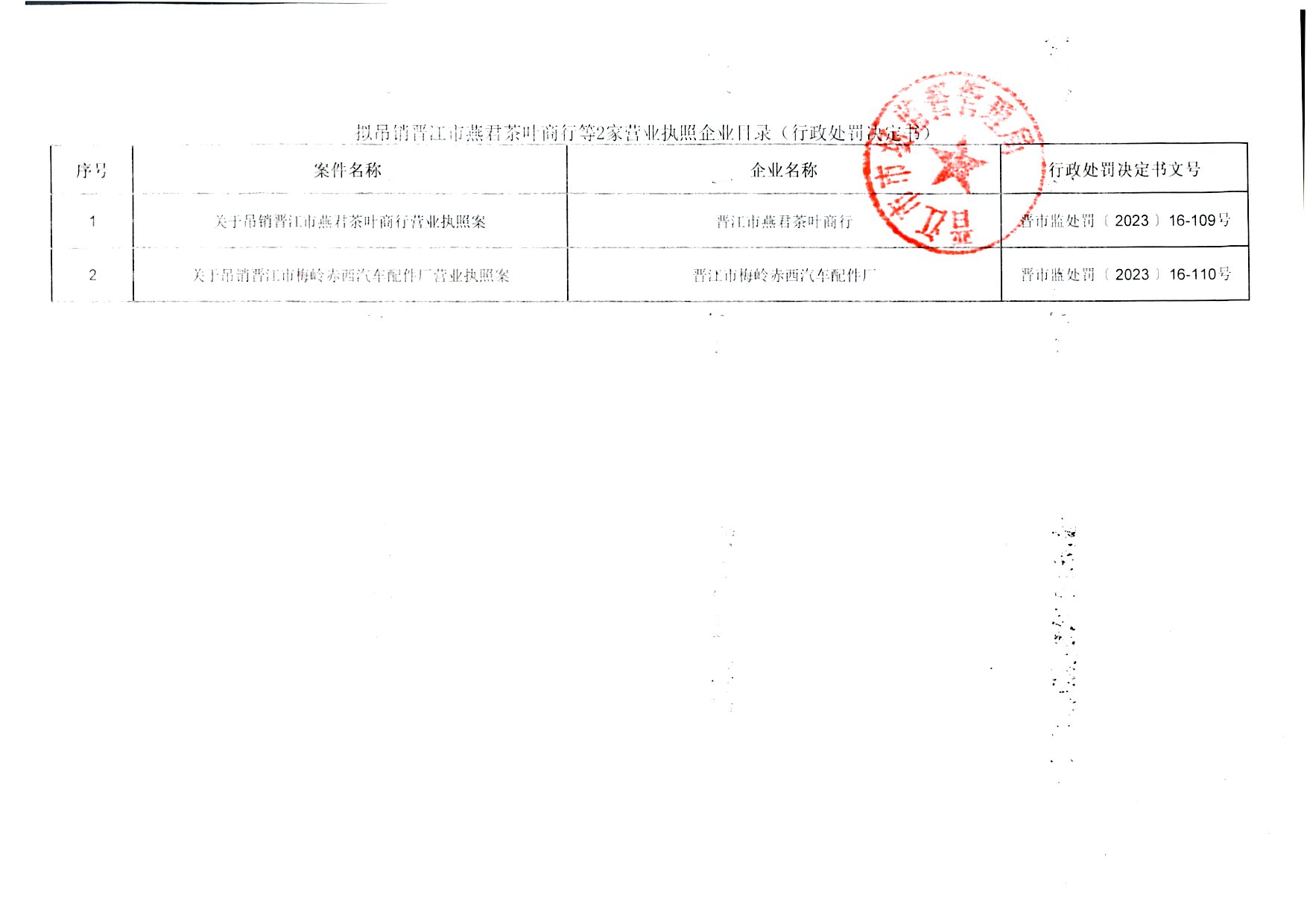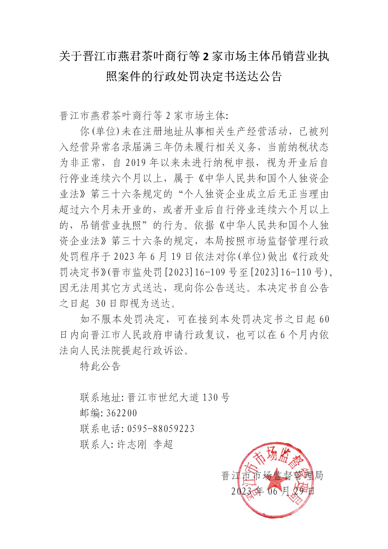 晋江市市场监督管理局关于晋江市燕君茶叶商行等2家市场主体吊销营业执照案件的行政处罚决定书送达公告