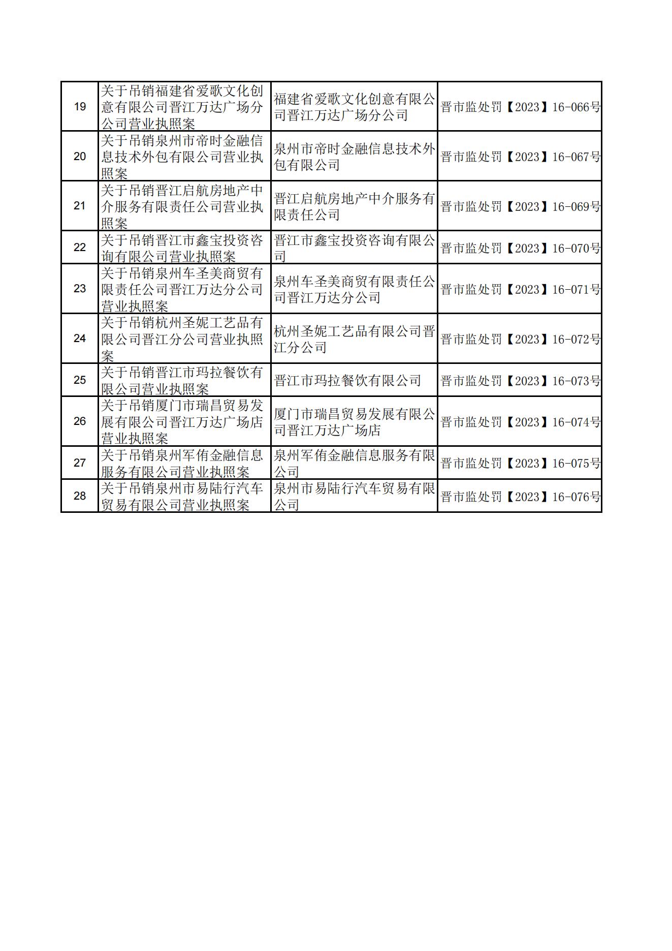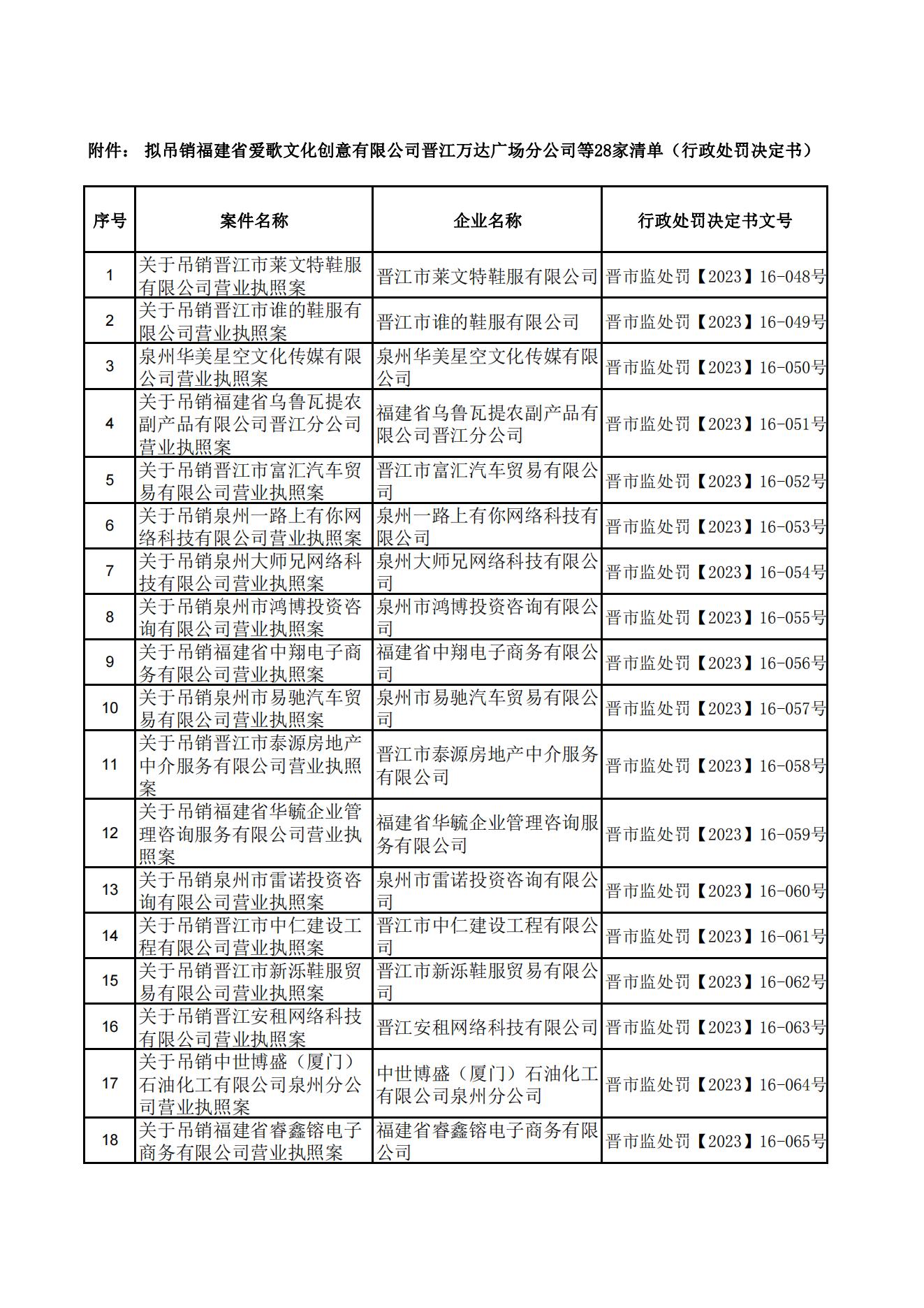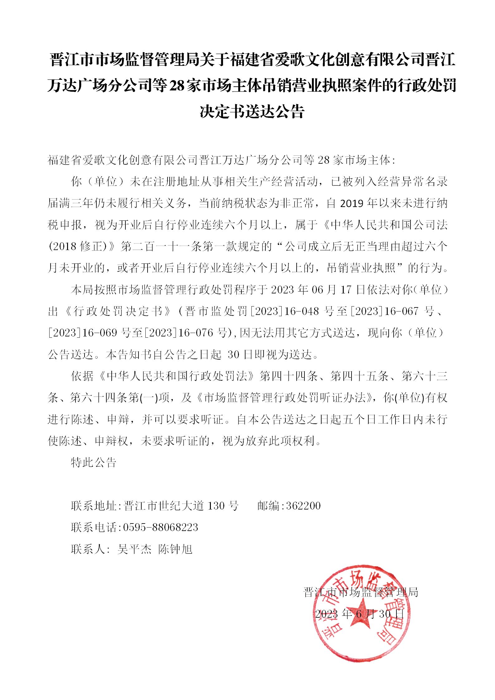 晋江市市场监督管理局关于福建省爱歌文化创意有限公司晋江万达广场分公司等28家市场主体吊销营业执照案件的行政处罚决定书送达公告