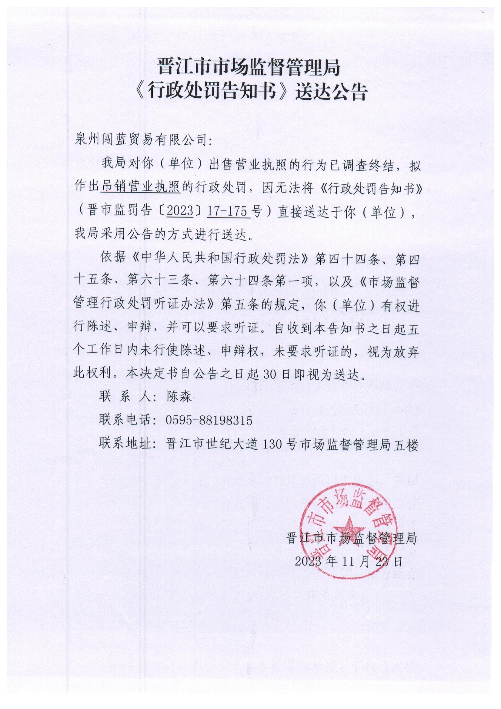 晋江市市场监督管理局行政处罚告知书送达公告(泉州冉海贸易有限公司)