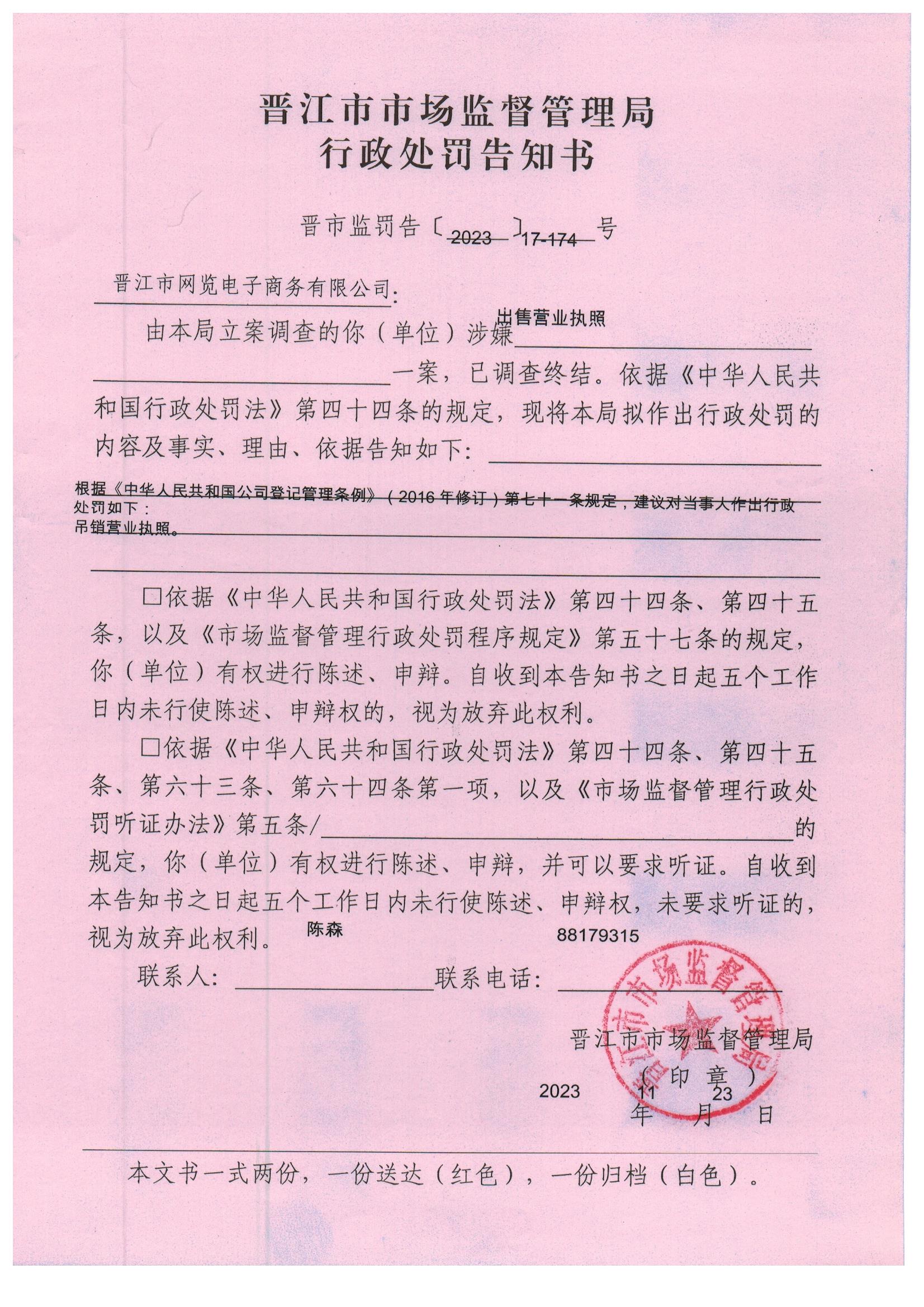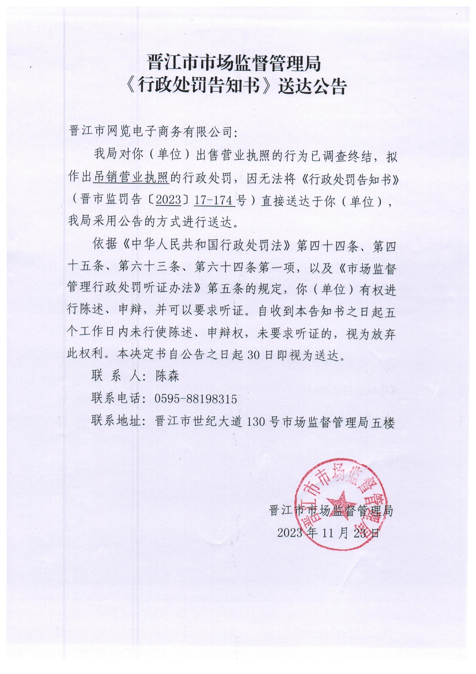 晋江市市场监督管理局行政处罚告知书送达公告(泉州网览电子商务有限公司)