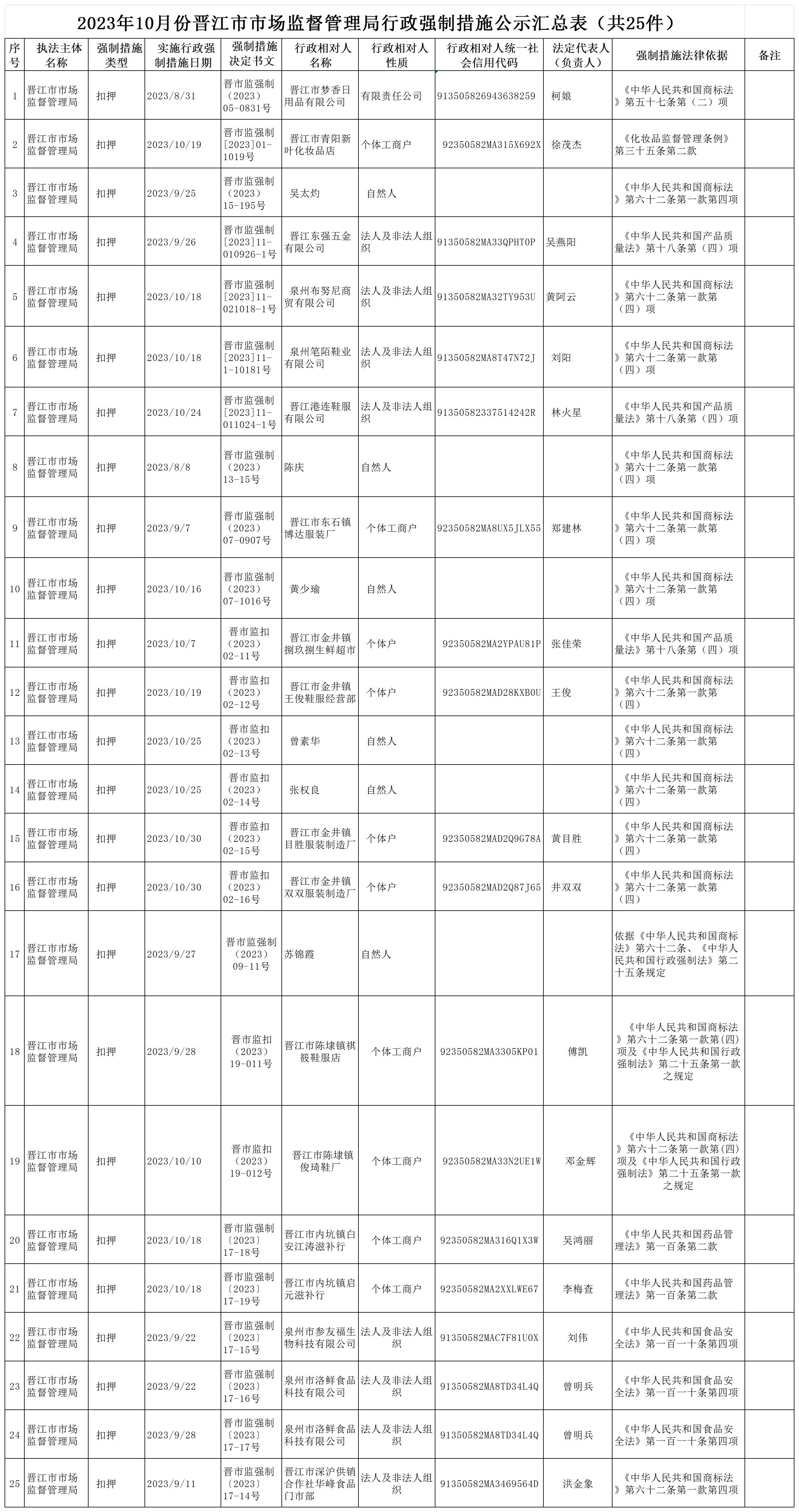 2023年10月份晋江市市场监督管理局行政强制措施公示汇总表(共25件)
