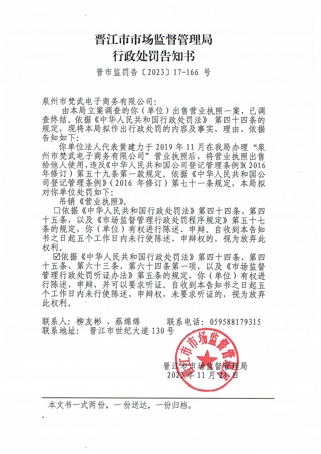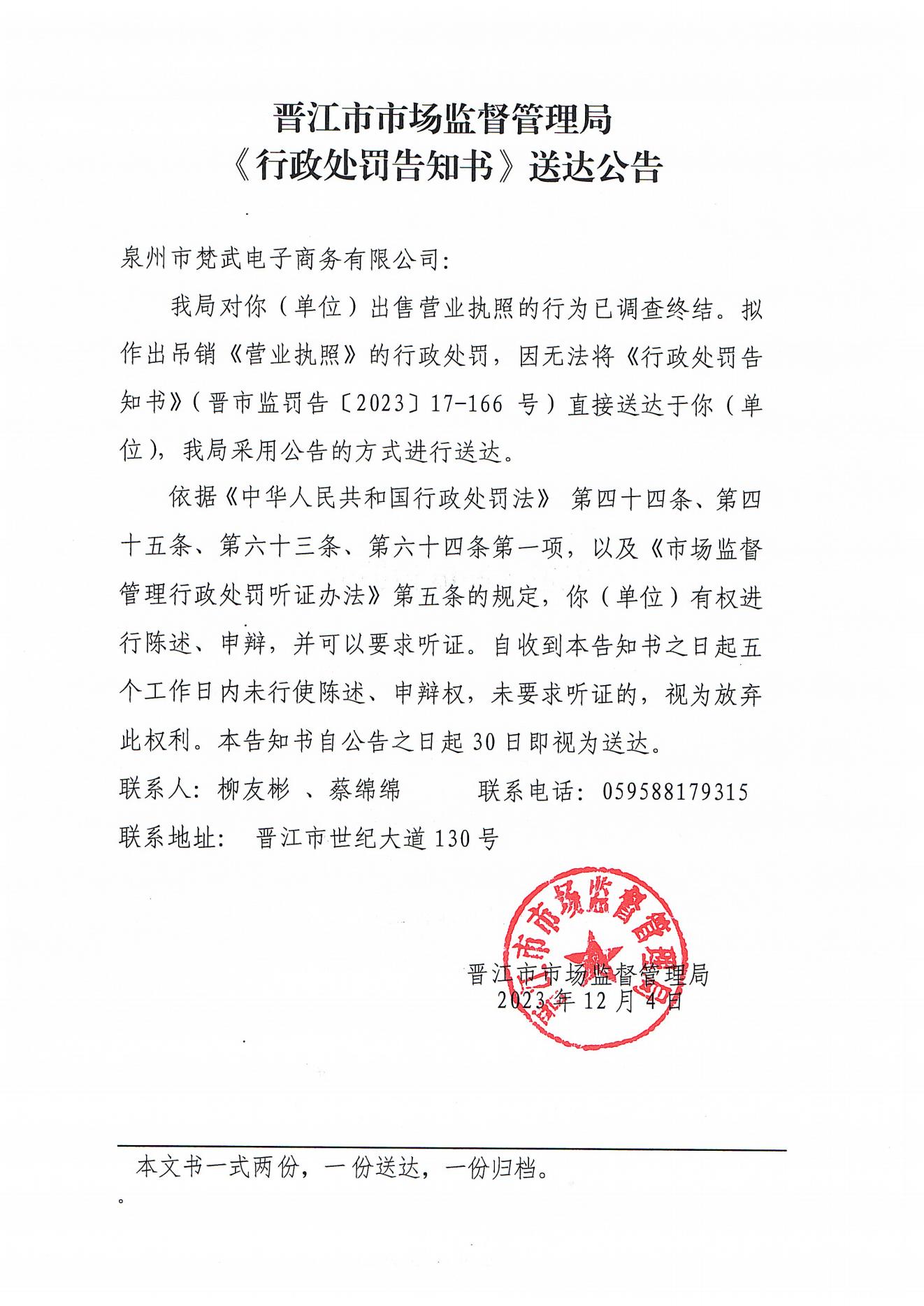 晋江市市场监督管理局行政处罚告知书送达公告(泉州市梵武电子商务有限公司)