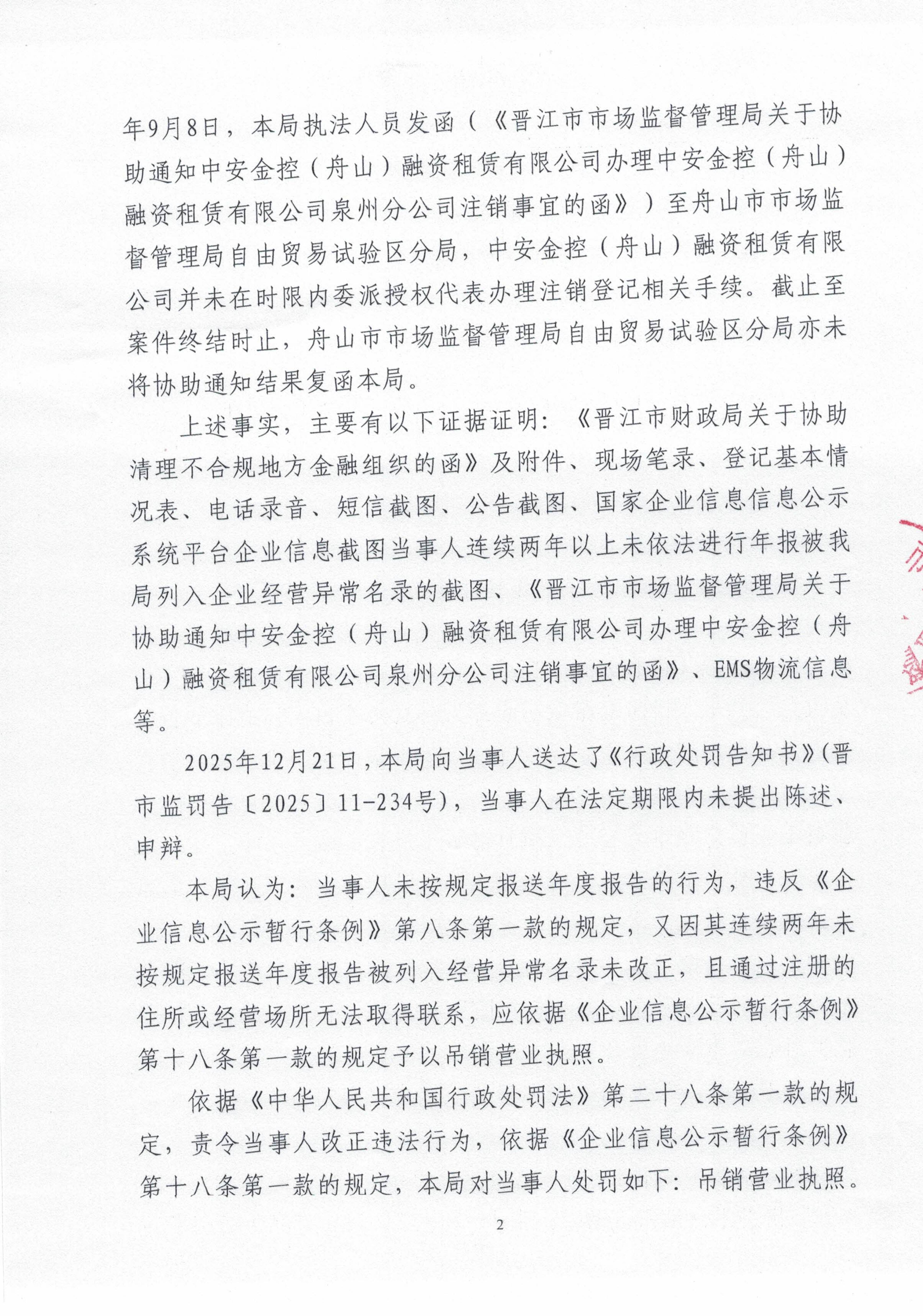 晋江市市场监督管理局行政处罚文书送达公告(中安金控(舟山)融资租赁有限公司泉州分公司 晋市监罚送处〔2026〕11-001号)