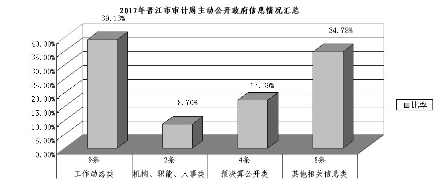 工作动态类的信息9条,占39.13%(其中:计划进度类信息9条);机构、职能、人事类信息2条,占8.70%;预决算公开信息4条,占17.39%;其他相关信息8条,占34.78%。全文电子化率达到100%。