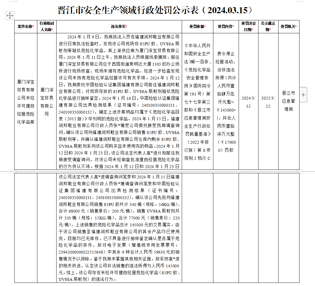 晋江市安全生产领域行政处罚公示表(2024.03.15)