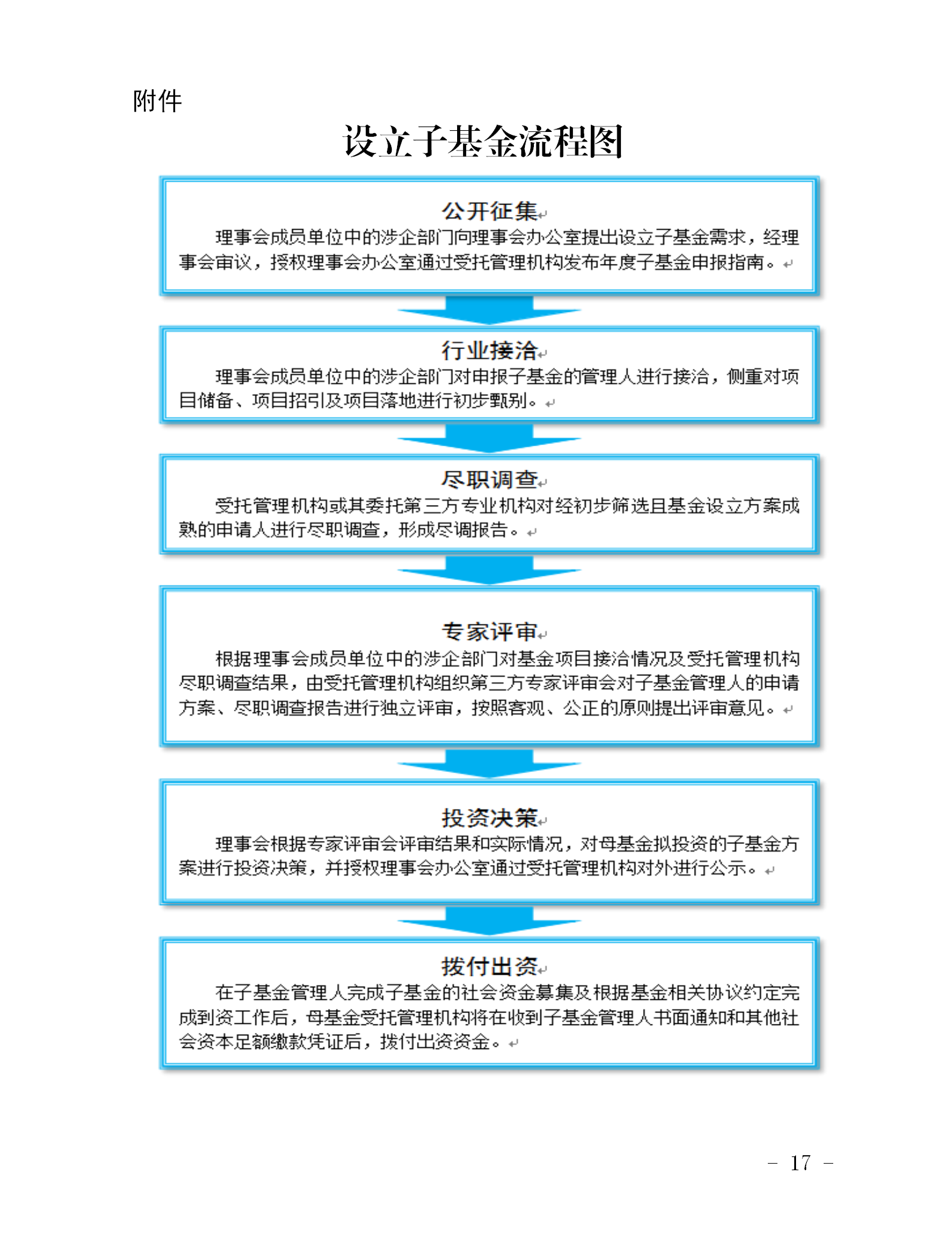 (一)公开征集。理事会成员单位中的涉企部门向理事会办公室提出设立子基金需求,经理事会审议,授权理事会办公室通过受托管理机构发布年度子基金申报指南。