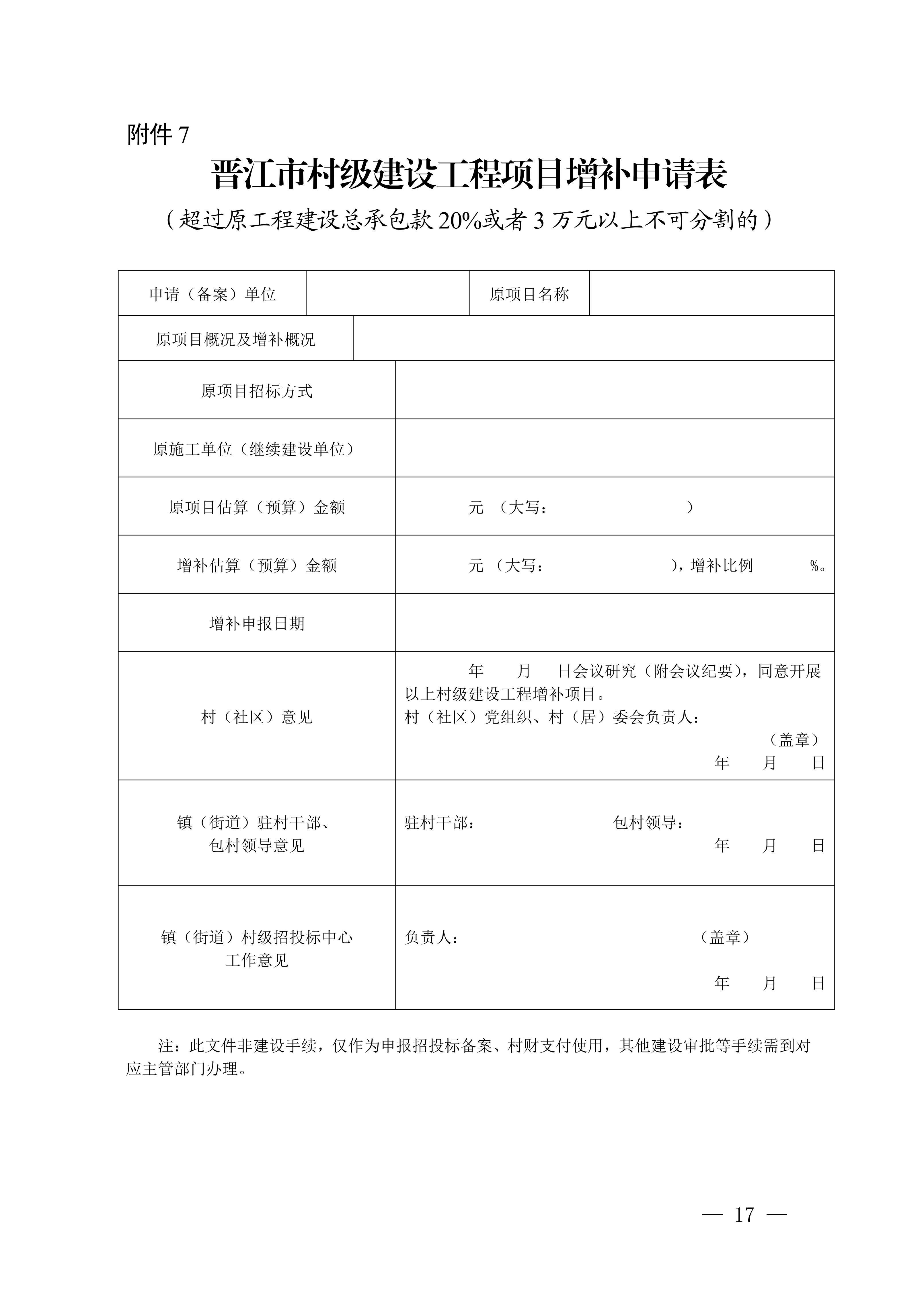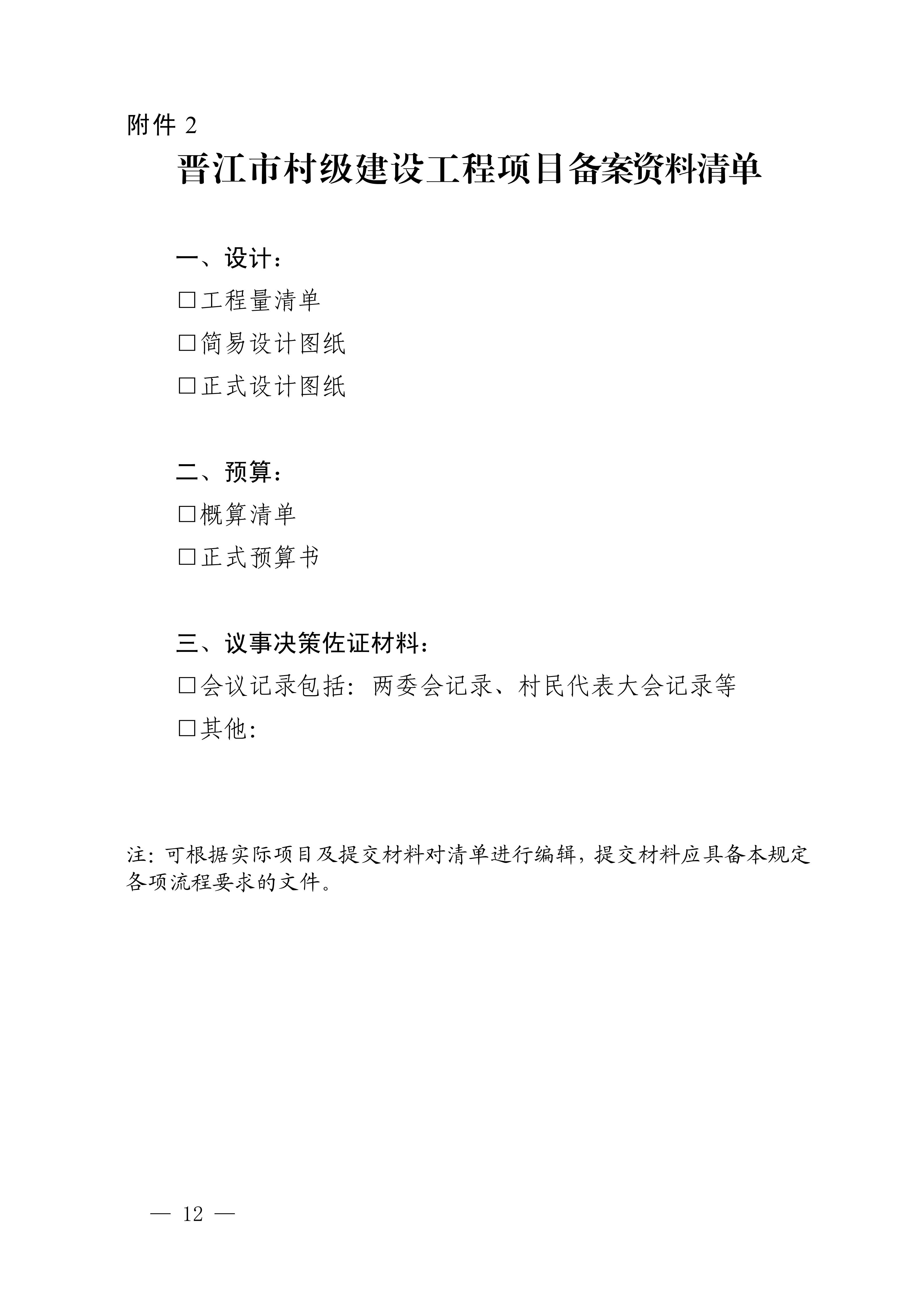 3.项目报备。对于所有非应急、零星等村级建设工程项目,村集体均应填写《晋江市村级建设工程项目申请表》(附件1)、《晋江市村级建设工程项目备案资料清单》(附件2),报村级招投标中心备案。其中,初步预算10万元以上的村级建设工程项目还需由镇(街道)驻村干部、包村领导签批审核。