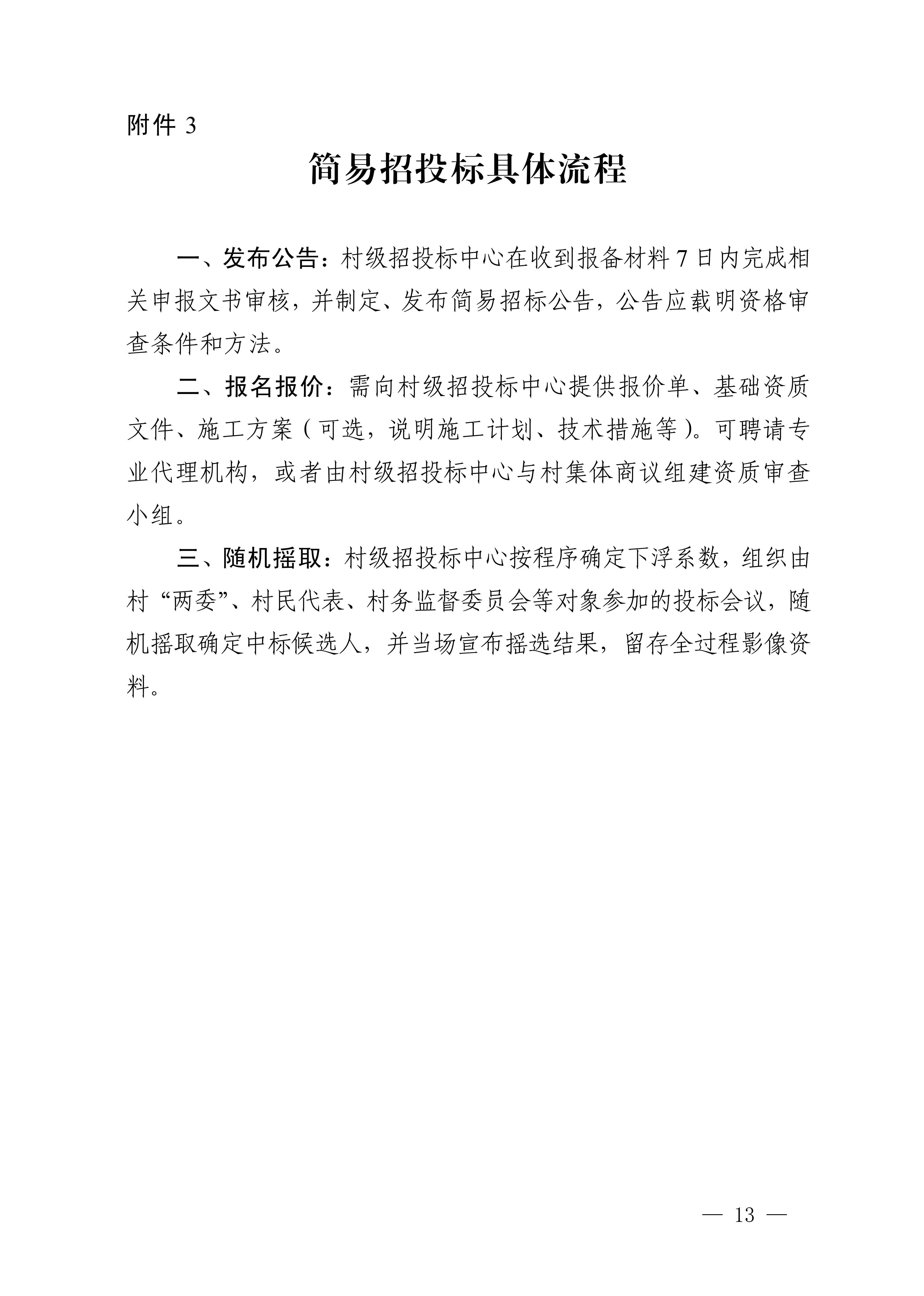 (1)单项工程预算审核在30万元以下的,由村(社区)“两委”集体研究,通过询价、邀标、竞争性谈判、竞争性磋商、简易招投标(详见附件3)、公开招投标等任意一种方式确定有资质的施工方。
