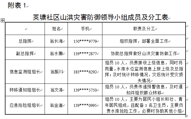 附表1:英塘社区山洪灾害防御领导小组成员及分工表