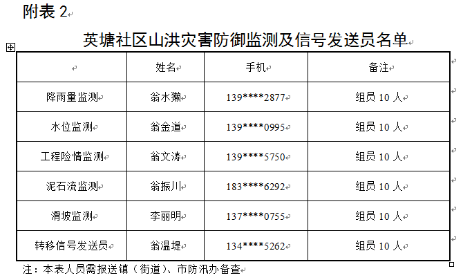 附表2:英塘社区山洪灾害防御监测及信号发送员名单