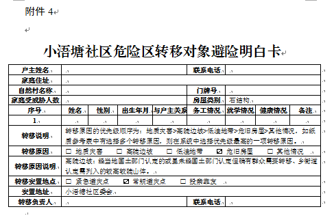 (3)制作危险区域建档立群众明白卡(卡内包含易受灾人员情况及转移安置信息表及转移安置路线图),将转移路线、安置地点、责任人等有关信息发放到每户。制作标识牌,标明安全区、危险区、转移路线、安置地点等。