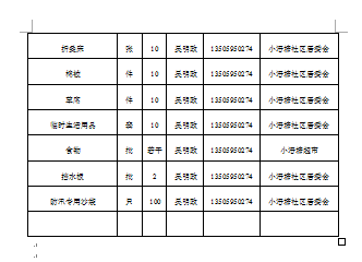 (三)物资队伍。社区防汛救灾物资仓库储备一定数量的安全防护、应急救援、抢险装备等物资,并有专人负责保管。组建社区级应急队伍,承担辖区防汛防台风期间突发险情先期处置、抢险救援工作。