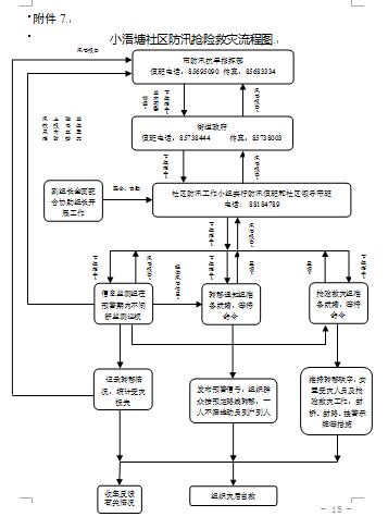 (三)抢险组织:接到巡查人员或居民发现灾情苗头的报告后,社区防汛工作小组迅速召集抢险救灾组人员到灾害点开展抢险救灾,避免险情扩大;组织专业人员修建临时道路、搭设临时供电线路,快速修复损坏公路和供配电设备,及时恢复交通和正常供电。