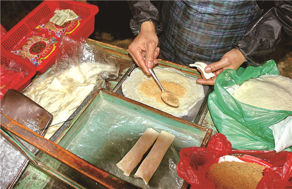 在闽南,润饼菜的叫法各异。晋江叫“润饼菜”或“润饼夹”,厦门叫“薄饼”或“春饼”。晋江润饼菜有两种味道,一是咸味,清明时做,裹料有葱蒜、豆干、豌豆、胡萝卜、三层肉、蚝仔煎、卷心菜、米粉丝等,加上炒土豆与香菜(芫荽),整好十样,寓为“十全十美”,这种咸味的通常叫“润饼菜”;另一种甜味,年兜、春节才做,平时偶尔也见叫卖,在润饼皮内里涂层麦芽糖,放入一块甜油■,包上两勺加糖的土豆末,卷成条状即可。后一种做法简单,吃也方便。立店口,一会儿工夫,就能卷吃三两条。这种甜味的通常叫“润饼夹”,以金井下丙街头一摊为佳。