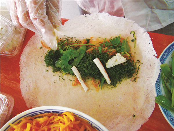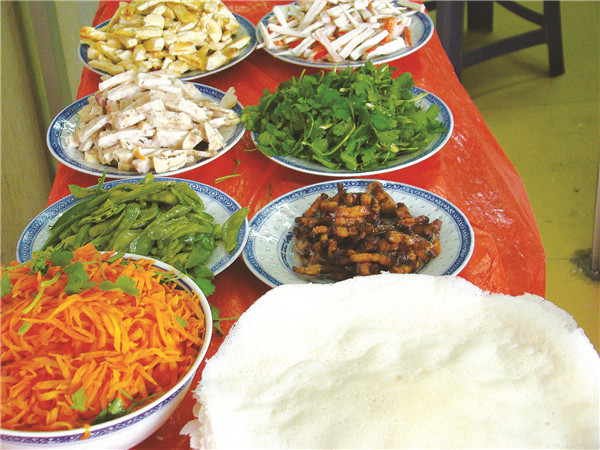 无论缘于时令,或与历史人物牵系。润饼菜由来虽众说纷纭,但食之甘饴则是不争之实。闽南人林语堂偏爱食之,每逢清明,必设“润饼家宴”,用料颇丰,除寻常食料,还有虾仁、香菇与冬笋。当然,林家富裕,非一般寒门可比,吃物自然丰富。润饼皮,因其色乳白,曾被林语堂之女林太乙喻为“白纱包着的礼物”。