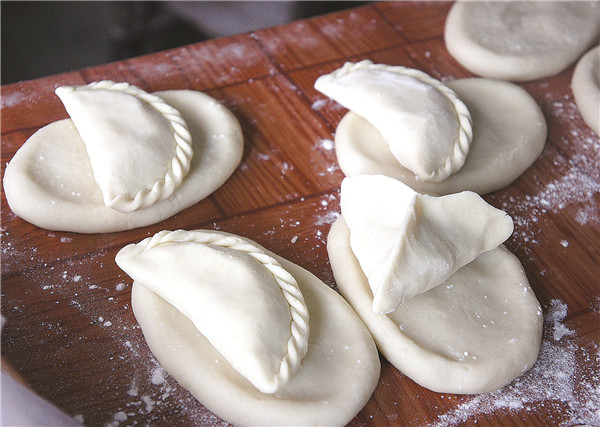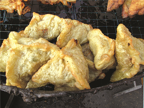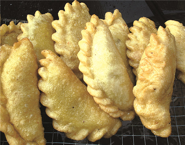 案台盘子里已有炸好的,有的形若弯月,有的似三角状,有的呈圆形。问了那小夫妻,才明白过来。