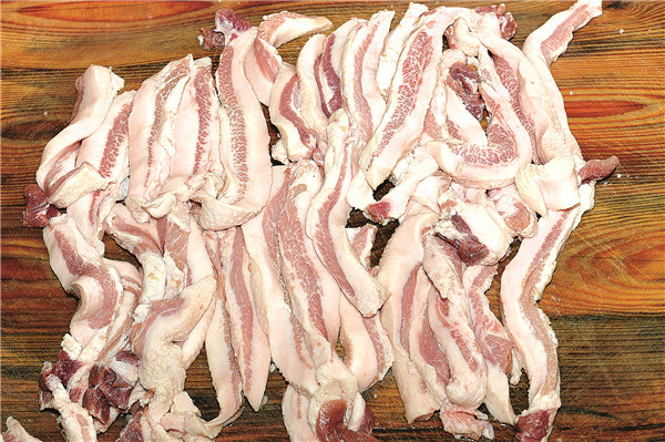 1.选用三层肉,剔掉肉皮,细切成一块块的小薄片;