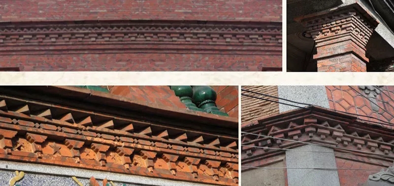 韵路造型是墙面装饰的一种手段,为显现层次或收煞而设计;也以出挑遮雨水为目的。利用红砖可雕塑性,打造出各种形状图形。