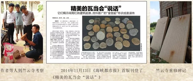 2014年11月13日《海峡都市报》首版刊登了《精美的瓦当会“说话”》实图瓦甑(垂珠)三十四片,称为唐代以前及唐宋各个年代的早期瓦甑,显然让我们看到竺云寺中的早期砖瓦碎片同泉州文保中心提供瓦甑图片的一些共性。同时它可以推翻红砖是16世纪由西班牙人那里学来的猜想。