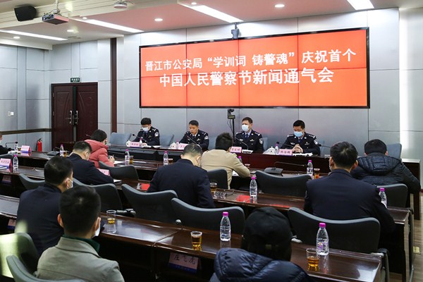1月10日上午,我局召开“学训词 铸警魂”庆祝首个中国人民警察节新闻通气会。泉州市公安局党委委员、晋江市副市长、公安局长李森建,政委苏家明、副局长洪进南、局党委委员陈金超出席。发布会由苏家明政委主持。