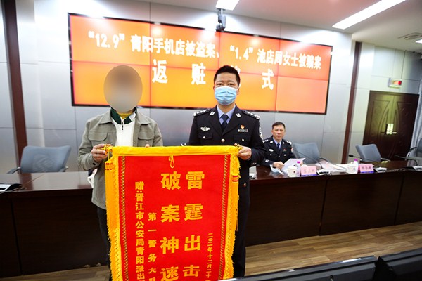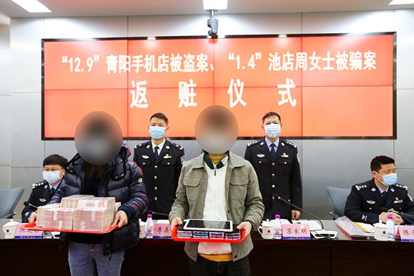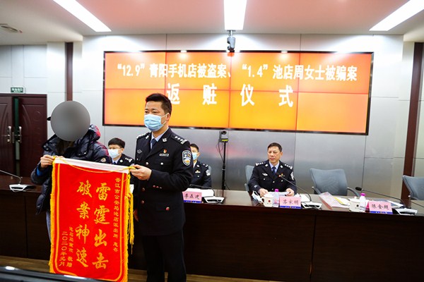 通气会上,还举行了返赃仪式,我局民警快速反应,接连破案挽损,现场发还了追回的80万元现金和32部被盗手机、平板、笔记本电脑。为感谢民警快速破案、追回钱款,受害者专门送来锦旗。