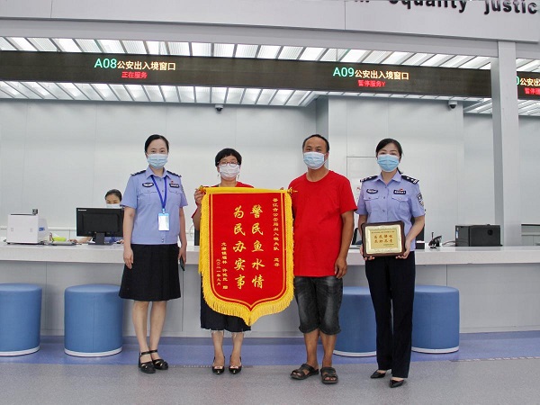 9月23日上午,满心欢喜的许某夫妇特地身穿红色上衣将一面“警民鱼水情 为民办实事”锦旗和一幅“为民解忧 尽职尽责”的牌匾,赠送给晋江市公安局出入境管理大队副大队长尤丽超。