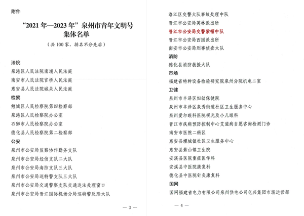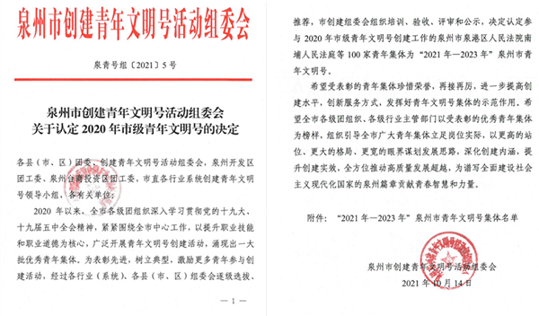 10月14日,泉州市创建青年文明号活动组委会发布《关于认定2020年市级青年文明号的决定》,交警大队紫帽中队荣获了“2021年—2023年”泉州市青年文明号先进集体。