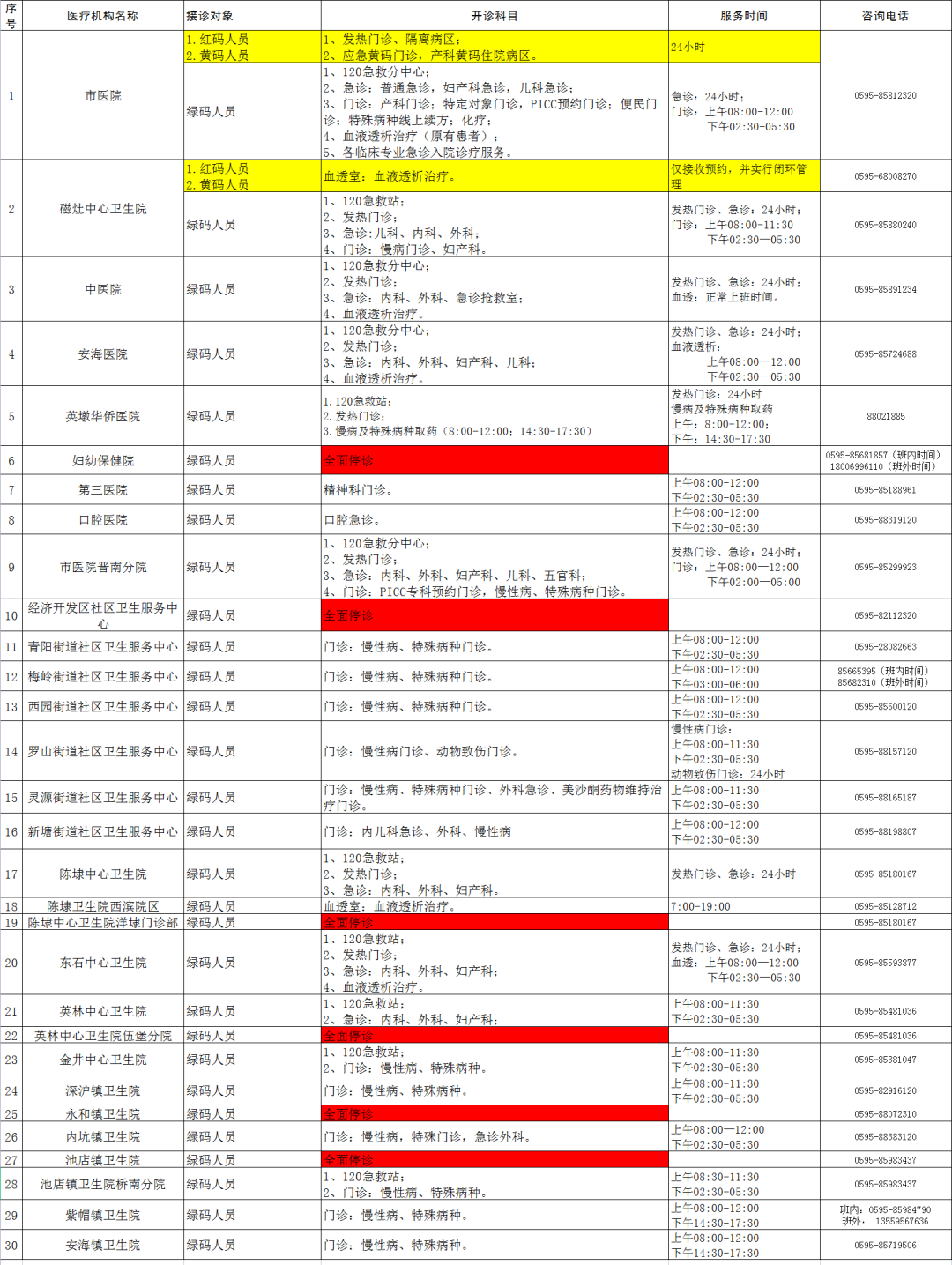 晋江市公立医疗卫生机构开诊情况表