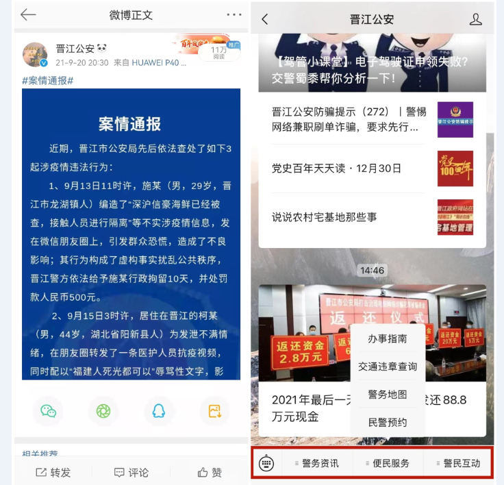 我们把新媒体平台建设定位为创新警务公开的工作机制、了解社情民意的网上渠道、促进民生问题解决的有效载体、推进平安晋江建设的具体措施。一是掌握社情。全天候、持续性地围绕工作中心工作,广泛收集群众的意见、建议和诉求,使我局党委决策更加贴近民意。2021年,在晋江公安微信公众号发布警务信息1800多条,被人民公安报、中国警察网、福建警方等官方微信共采用150余篇;在@晋江公安官方微博发布信息18200余条,被@中国警方在线、@警民携手同行、@公安部刑侦局等部局级以上官方媒体转载70多条。二是深化交流。通过新媒体建立了与群众零距离沟通的有效平台。2016年以来,我局通过新媒体先后开展“‘平安中国’系列网络访谈”“全省公安局长系列微访谈活动”等“一把手”访谈活动6次,极大拉近了公安机关与群众的距离。今年6月,我局受国务院命名表彰“特别能战斗刑警队”功模代表、刑侦大队大队长李卫阳做客《人民网》演播室参加访谈活动,通过新媒体直播,就群众关心的打击犯罪等问题与广大网友进行了充分交流。三是考评推动。晋江公安新媒体作为群众的“网上意见箱”,对收集的各项诉求快速立项分解,全程跟踪问效,力求在最短的时间内抓好落实、解决问题;每个月对各所队室新媒体平台运行情况进行考评,结果纳入全年绩效排名;并通过建立问责制度,坚决杜绝因工作不力、责任心不强、答复草率等原因造成不良影响和在解决群众问题中敷衍塞责等情况。