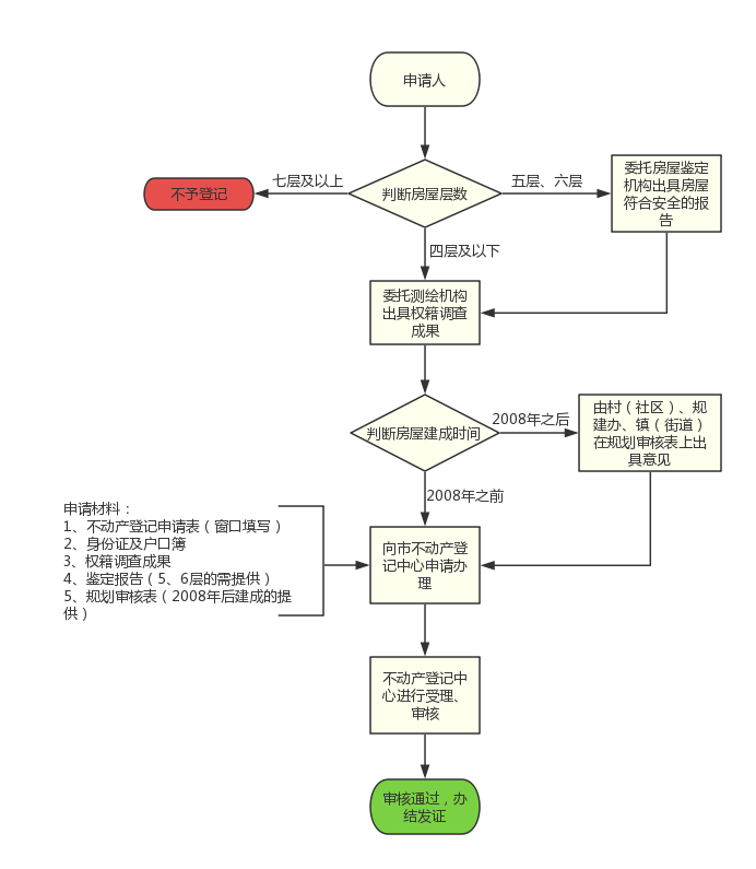1、在2008年1月1日之后建成的房屋,需不动产所在村(社区)、镇(街道)规划建设办以及镇(街道)出具《规划审核表》(表格可向镇(街)规划建设办或市不动产登记中心领取)。